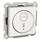 Timer för infällt montage i standard apparatdosa med 60mm fästskruvavstånd eller utanpåliggande med förhöjningsram. Ram, centrumlock ock knapp av halogenfri termoplast. Potentialfri reläutgång med växlande funktion för 10A 230V AC eller 10A 24V DC. Tidsinställning i 6 olika steg mellan 15min till 8tim. Lysdiodindikering vid aktiv koppling. Montagedjup 24mm.