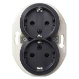 2-vägsuttag 16A, skruvanslutning, petskyddat. För infällt IP20-montage i apparatdosa c/c 60 mm eller utanpåliggande montage i utanpåliggande dosa 25 mm. Uttagen har två neutrala överkopplingsklämmor Levereras med klor. Kompletteras med valfri Renova-ram för 2-vägsuttag.