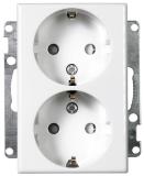 Sockel och centrumplatta av halogenfri termoplast. Dubbla anslutningar per fas. Skruvanslutning. Säkerhetsuttag. Levereras utan kombinationsram, komplettera med kombinationsram 2-fack. Även lämplig för 2-facks förhöjningsram 35 mm eller hörnbox. Kräver dubbeldosa vid infällt montage.