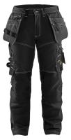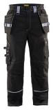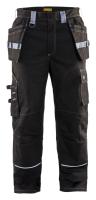 2 löst hängande CORDURA®-förstärkta spikfickor – den ena med två extra fickor varav den ena med dragkedja, den andra med 3 mindre fickor och verktygshällor, 2 framfickor, varav den ena med vinklad telefonficka, 2 breda och rymliga CORDURA®-förstärkta bakfickor, D-ring, hammarhank, extra bred bälteshälla mitt bak, dubbel förstärkt grensöm, rymlig benficka med tryckknapp, extra ficka med dragkedja, telefonficka och id-kortsficka, tumstocksficka i CORDURA® – bekvämt placerad över sidsömmen och lös i botten – med verktygsficka, pennficka och knapp, hälla för kniv, förböjda ben, knäfickor i CORDURA® med öppning inifrån och reglerbar höjd av knäskydden, CORDURA®-förstärkning i benslut, reglerbara benslut med tryckknappar, reflexpasspoal fram och bak på nederdel av ben, hårt utsatta fickor är nitförstärkta, kontrastsömmar. Förstärkningar i CORDURA®. OEKO-TEX®-certifierad. Material: 60% bomull, 40% polyester, canvas, 330 g/m². PFAS-fri