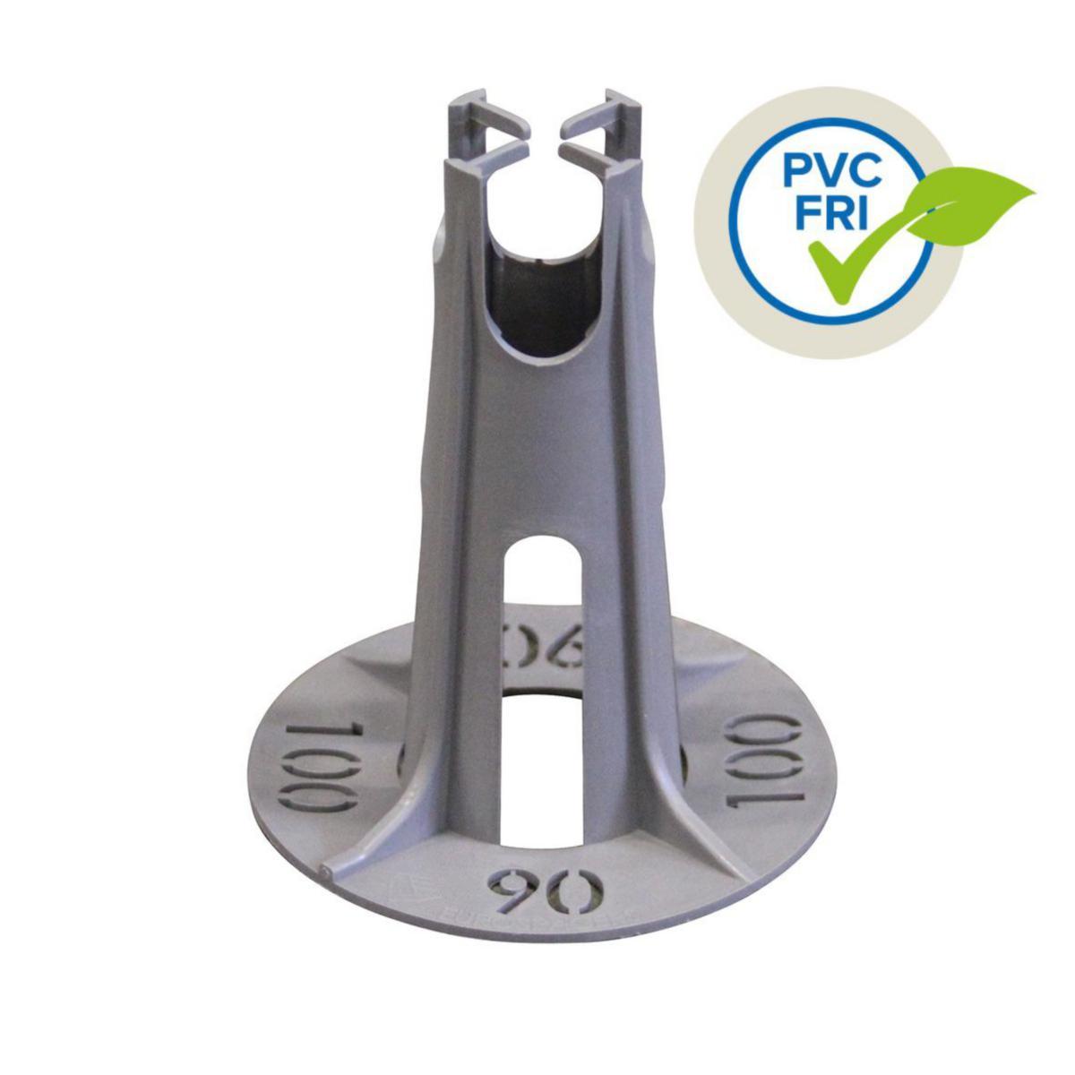 Markdistans avsedd för användning mot mjukt underlag, t.ex. isolering, sand, leca eller markduk. För järn med diameter upp till 16 mm. Täckskikt 15-150 mm. Den starka konstruktionen gör klossen till en mycket stadig och stabil markdistans. Beräknad åtgång 4-6 st per m² beroende på armeringsdimension och underlag. Markdistanskloss upp t.o.m. storlek 90/100 är fria från PVC!