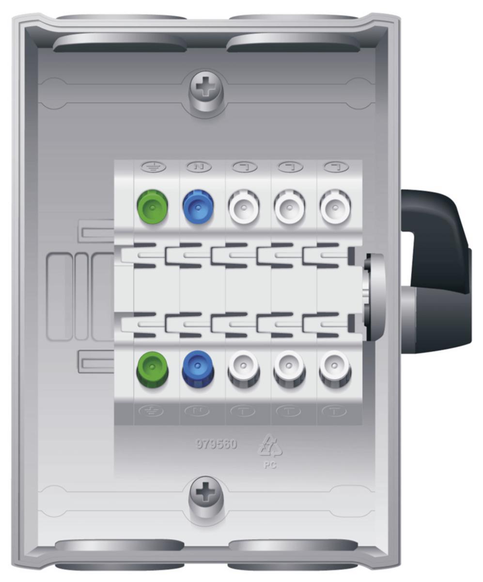 Säkerhetsbrytare SAQ 316H, grå plastkapslad 3-polig (+hjälpkontakt) brytare med 16A brytförmåga med skruvlös anslutning. Ledaranslutningen är fjäderbelastad, vilket gör ledaranslutningen snabb och håller rätt kontakttryck oavsett ledartyp. Försedda med sidomonterat låsbart vred samt lägesindikering. Kapslingen håller IP65, tillverkad i polykarbonat och har 4st knockout för förskruvningar med gänga M25. I botten finns en anvisning för kabelingång med membrangenomföring av mjuk plast, även monteringshålen är täta med mjuk membranplast. Brytarna levereras inklusive 2st gråa M25 kabelförskruvningar. Plastmaterialet Polykarbonat (PC) är speciellt känt för sin extremt goda slagstyrka både i kyla och vid hög temperatur och bibehåller sina egenskaper bra även efter lång tids utomhusexponering. Materialet är resistent mot svaga syror, alifatiska kolväten, paraffin, alkoholer (ej metanol). Däremot är den inte så beständig mot olja, fett och lösningsmedel. Polykarbonat (PC) bör ej utsättas för varmt vatten +60°C över en längre period. Vi rekommenderar därför metallkapslade brytare i tex. restaurangkök. Kapslade lastbrytare / frånskiljare enligt IEC 60947-3 även för användning som säkerhetsbrytare där sådana krävs. Enligt gällande bestämmelser skall säkerhetsbrytare vara inkopplad i huvudkrets för att frånskilja anläggningsdel vid mekaniskt eller elektriskt arbete och att förhindra oavsiktlig inkoppling av sådan anläggning under pågående arbete. Då en säkerhetsbrytare endast skall användas för att frånskilja anläggningsdel är det nödvändigt att i en anläggnings elkrets ha både elkopplare för start och stopp samt separat elkopplare som säkerhetsbrytare. Lastbrytare / frånskiljare enligt IEC 60947-3 kan användas dels som säkerhetsbrytare och dels som separat elkopplare.