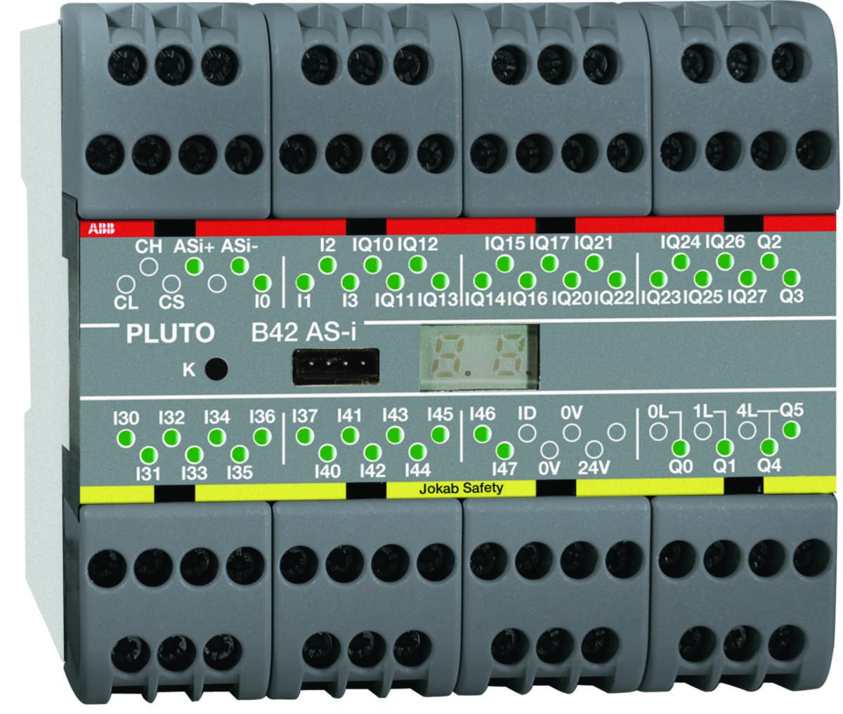 Säkerhets PLC med AS-i buss och Pluto säkerhetsbuss. Totalt 42 I/O: 20 felsäkra ingångar + 16 icke-felsäkra utgångar/felsäkra ingångar + 4 individuellt felsäkra reläutgångar + 2 individuellt felsäkra transistorutgångar.