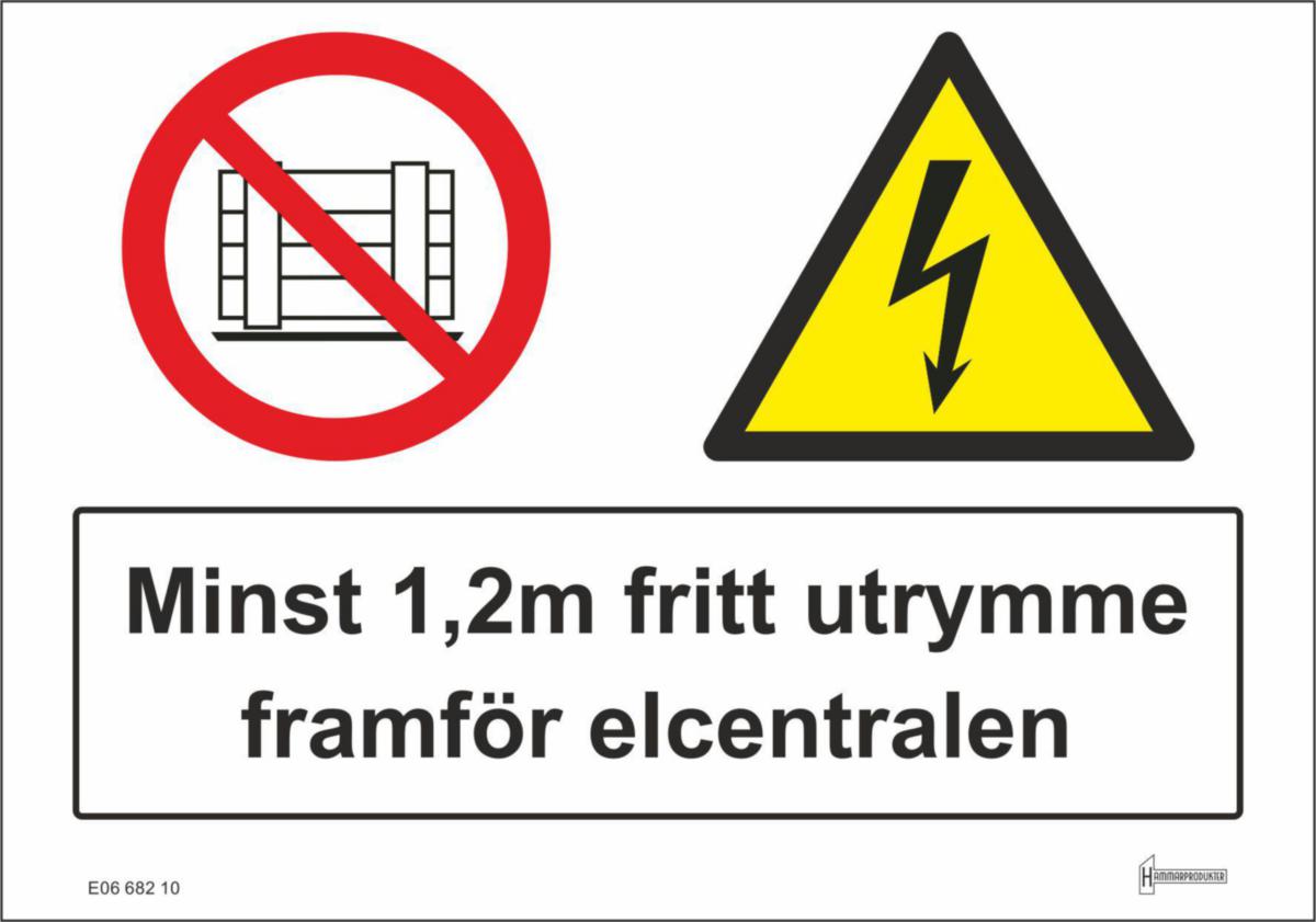 Minst 1,2 m fritt utrymme framför elcentralen. Förbudsskylt.