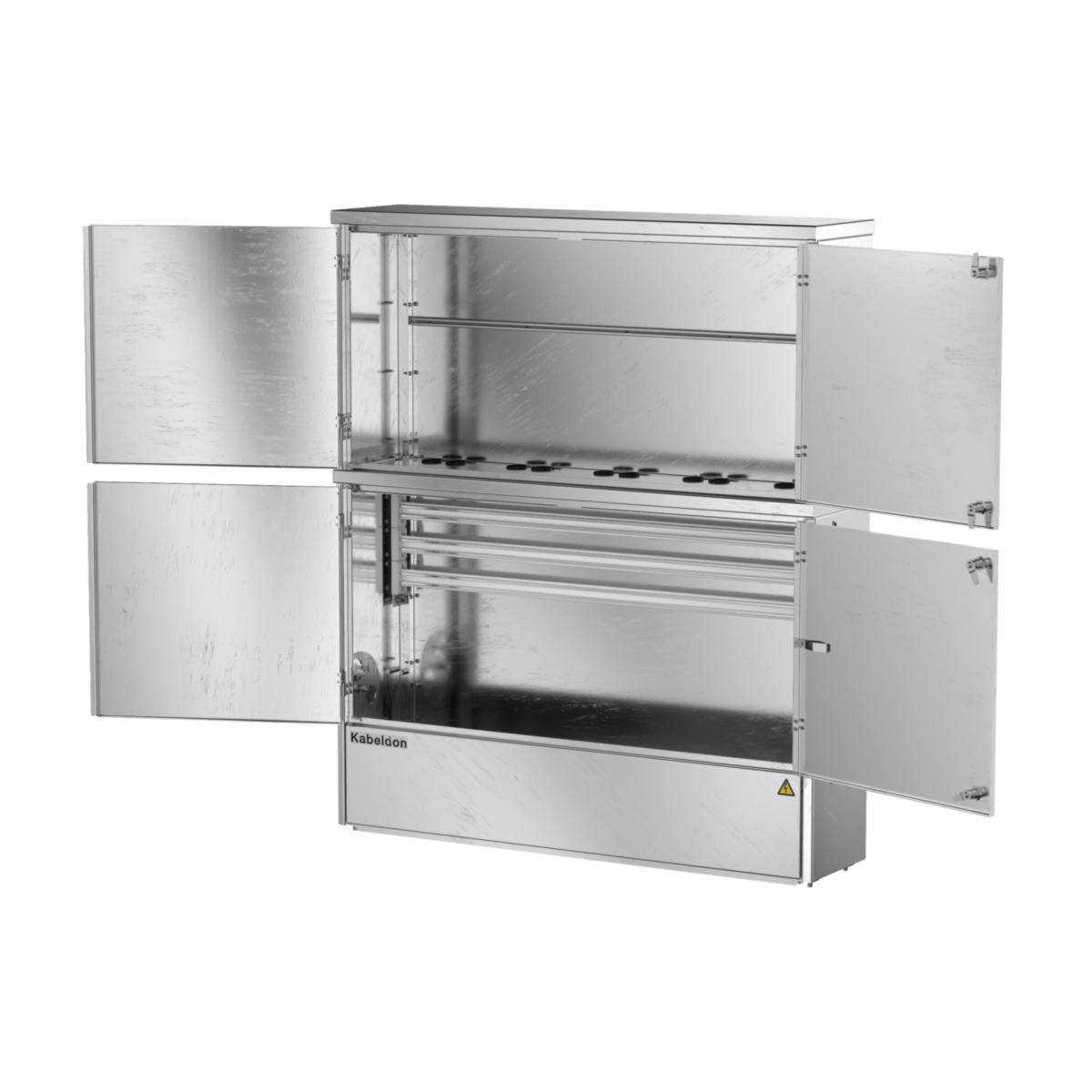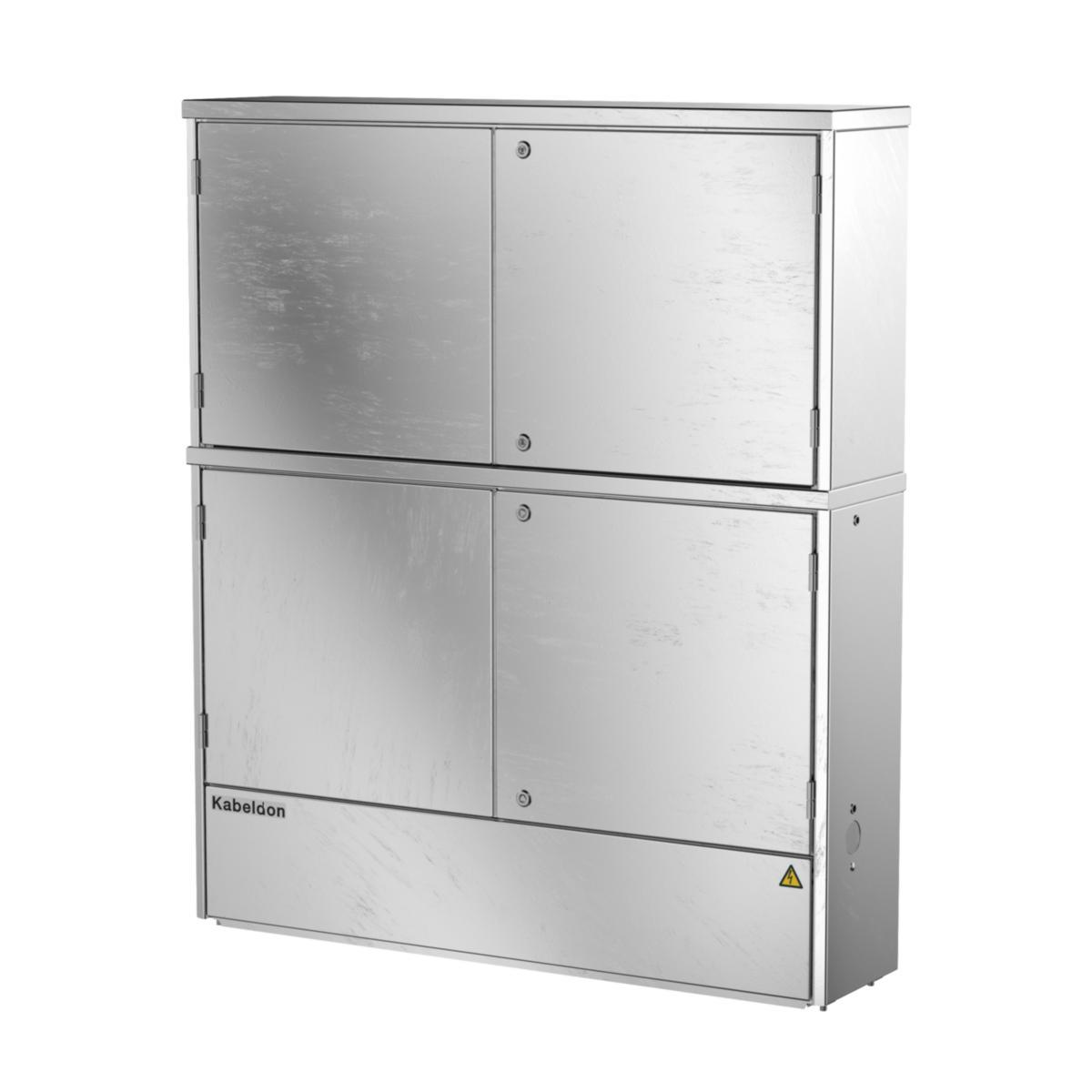 Ovandelen är kan användas som utrymme för kWh-mätare eller förses med montageplatta för olika ändamål. Mellan delarna finns öppningar för kabelgenomföring Ø 50 mm. Gavlarna är försedda med fäste för t.ex. markeringsstång eller tillbehörsskåp. Kapslingens djup på 312 mm möjliggör montage av samtliga elkopplare med oberoende handmanöver. Testad enligt SS-EN 61439-5 och uppfyller kraven för arktiskt klimat. Fundament ingår ej. Skyddsnivå skåp IP34D.