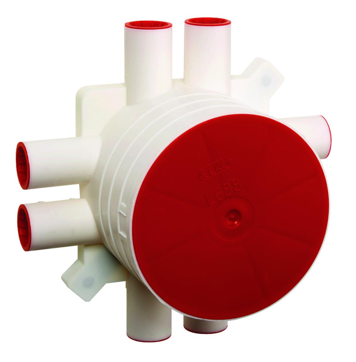 Takdosa, infälld. Dosan levereras med tätningar och spärrfjädrar, samt putslock. Rörstutsarna är för 16 mm men passar även tillsammans med rörmuff för 20 mm. Levereras komplett med fästskruvar. Max. belastning 15kg. Halogenfri.