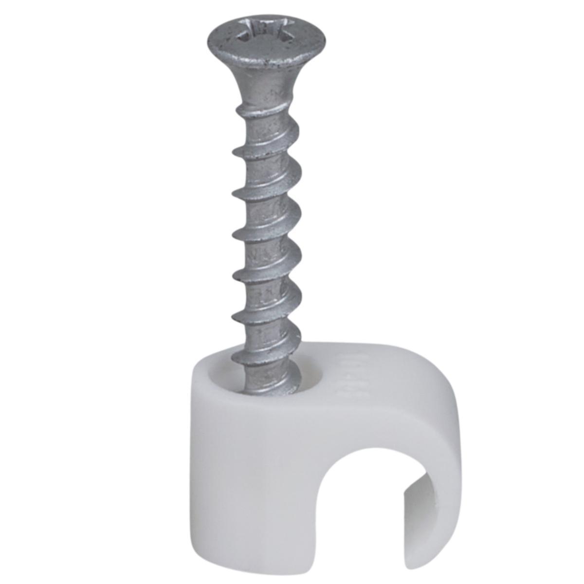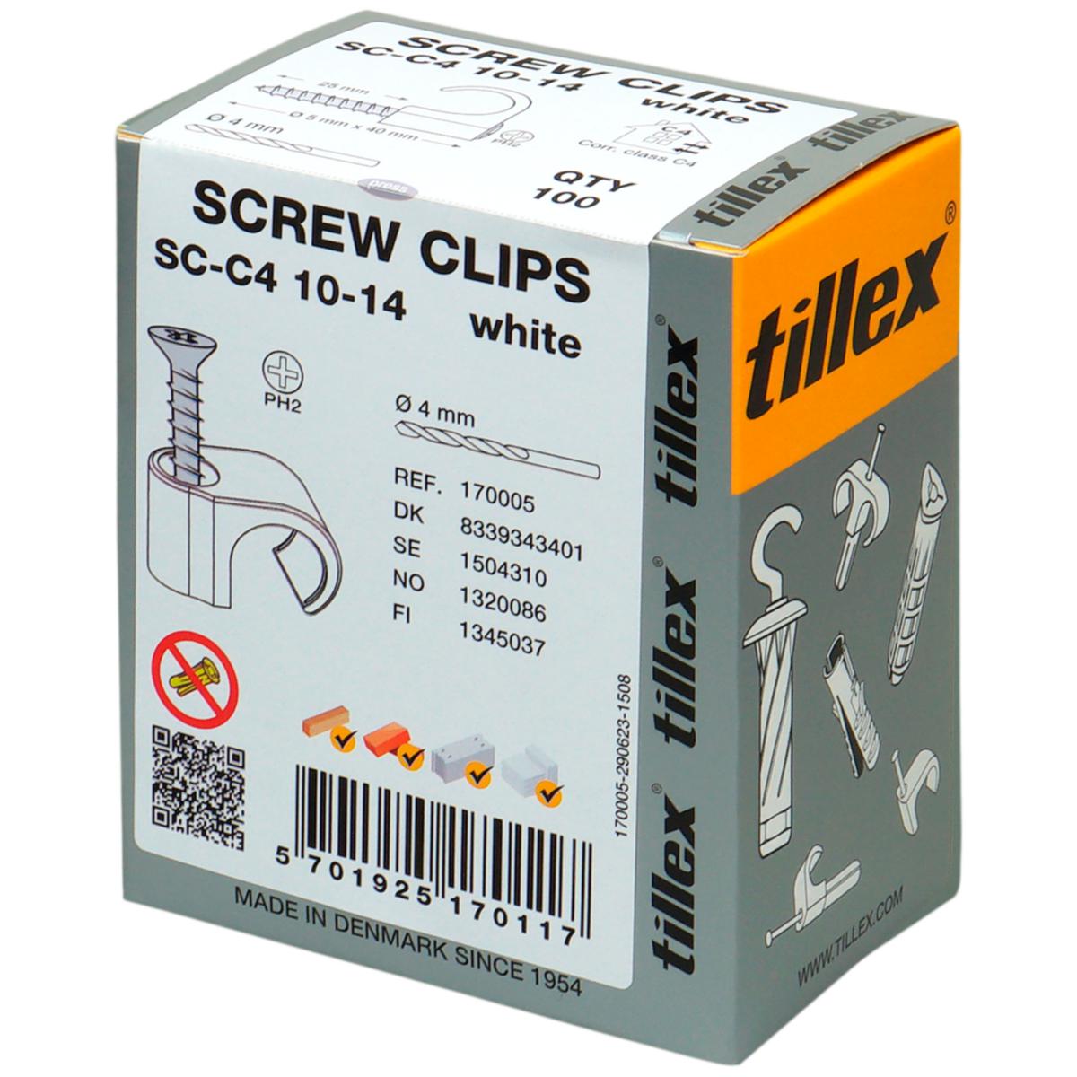 Tillex skruvclips är slagfast elastisk Polypropen som är halogenfri och UV-beständig i hög kvalité från fabriken i Danmark. För runda kablar 7-10mm i färgen Vit. Kraftig skruv 5x33mm vilket gör den lämplig för montage direkt i dubbelgips – om skruven överdras passar gul plugg i det hål som uppstått. I betong och tegel fästs skruven direkt i 4mm hål utan plugg. Försedd med Philips krysspår PH2 (Finns även med Torx T20). Korrosivitetsklass C4 vilket ger ett högt skydd utomhus.