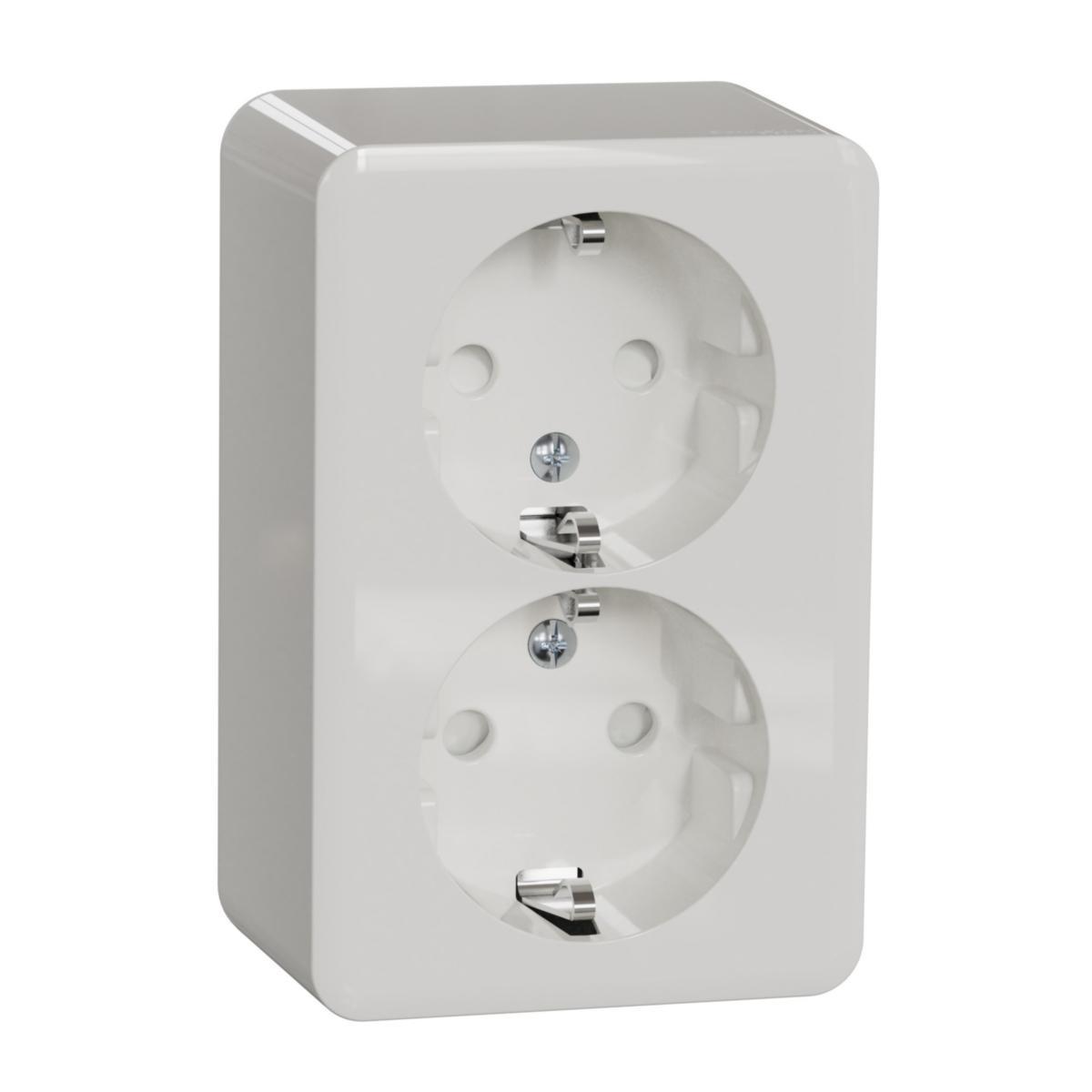 Wall socket for surface installation with integrated base plate. 16AX, 250V pet protected. Quick connection. Inputs for cables from the back through outlets in the base plate or from all sides using cut-outs in the cover. The product is IP20 (even with the cover removed). IP21 when the cable is inserted from below.