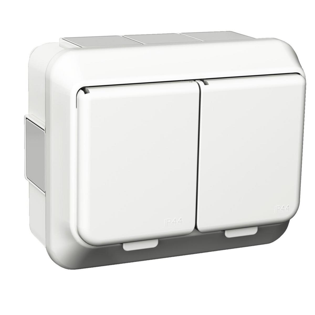 2-vägs vägguttag utanpåliggande med klafflock jordat , uttagen har två neutrala överkopplingsklämmor. Levereras komplett med utanpåliggande dosa.