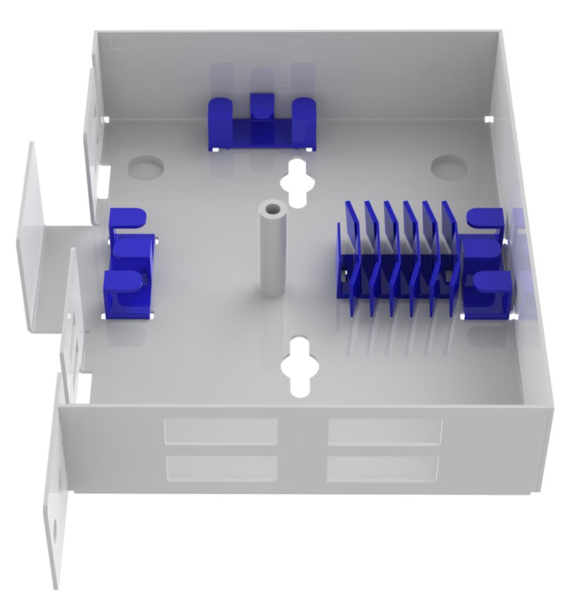 Traditionell kabel, mikrokabel och mikrodukt kan anslutas. Boxen har stand offs mot vägg. Kan förseglas med sigill. Skarvhylsor med max längd 45 mm rekommenderas. Styrning av fibrer i boxen garanterar min böjradie 30 mm.