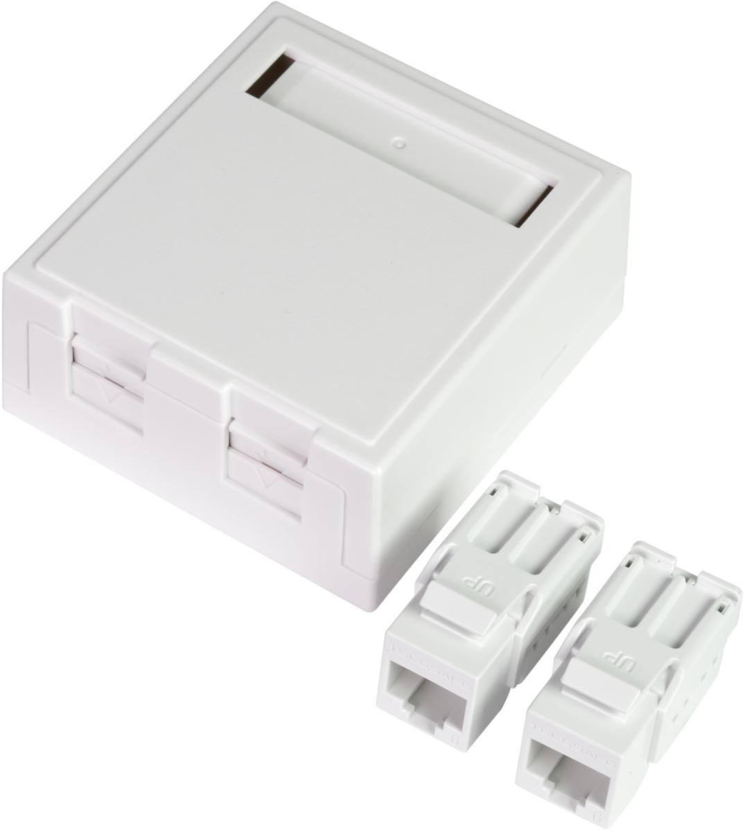 Modularuttag utanpåliggande med lucka och märkfönster. 1x8 eller 2x8 UTP C6 i kompletta uttagssatser, bestående av oskärmat modularjack TCS QuickConnect. Enkel och smidig kontaktering med verktyg. Kan kontakteras enligt 568A eller 568B. Jacket snäpps fast direkt i uttaget. Modularuttaget har utvecklats och designats enligt SS-EN 50173 serien och är en del av garantisystemet ELKO TCS.