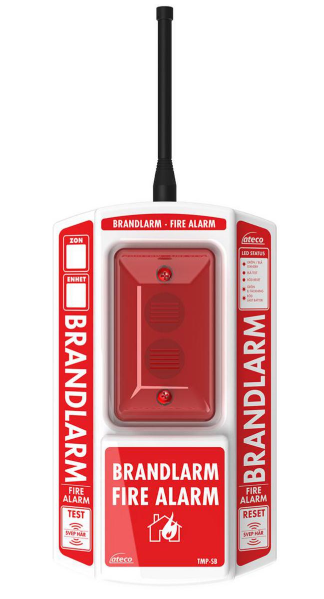 TMP-SB är ett trådlöst kombinerat larmdon (siren / blixt) som tillhör TMP-Serien för Trådlösa bygglarm. Enheten är en av de 40 olika adresserbara enheter som kan kopplas ihop trådlöst i ett system. När enheten aktiveras med annan larmknapp eller om brand detekteras via TMP rök eller värmedetektorer så ljuder 110 dB siren och en stark LED-blixt aktiveras. När allt är kopplat kan basstationen eller vilken enhet som helst som har larmknapp användas för att göra en reset på systemet.