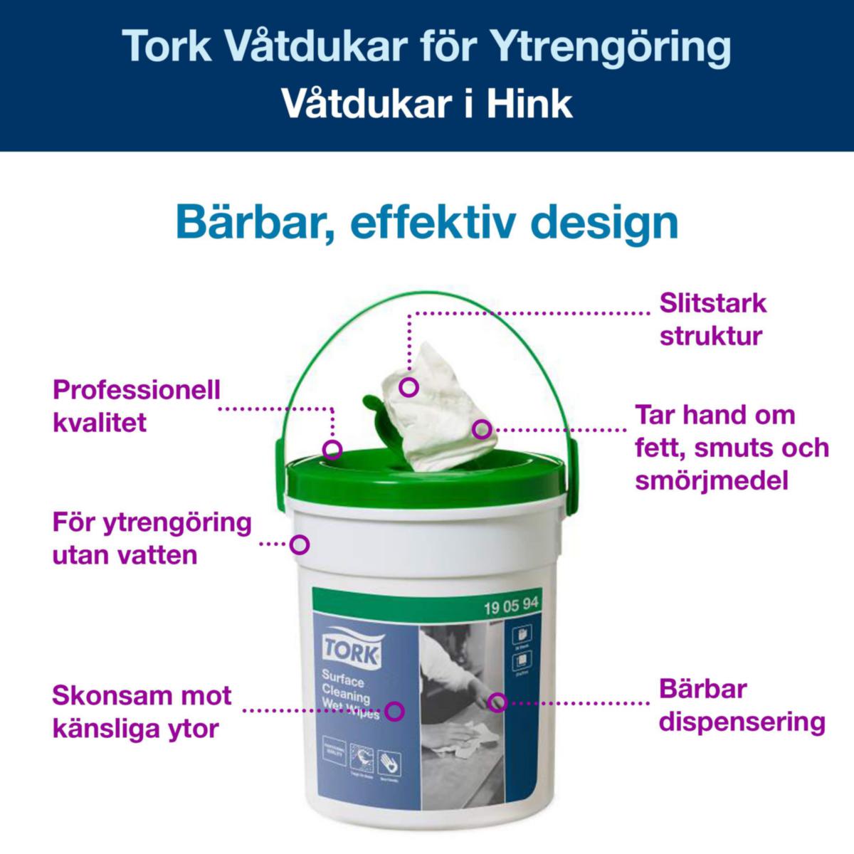 När det inte finns vatten tillgängligt men smuts måste städas undan – använd Tork Våtdukar för Ytrengöring. Dessa tåliga våtdukar är smidiga och effektiva när det kommer till rengöring av ytor och de tar snabbt bort fett, smuts, smörjmedel och olja, utan att vatten behöver användas. Med hjälp av vår bärbara hink är dessa våtdukar med professionell kvalitet alltid tillgängliga när du behöver dem. Oparfyrmerade. 27x13,5 cm. 58 dukar.