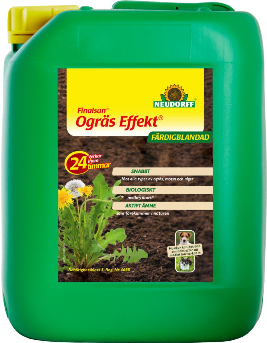 Ogräsmedel som med fettsyran pelargonsyra, effektivt bekämpar alla typer av ogräs – även flerårigt. Används med fördel bland buskar och träd, eftersom vedartade växter inte dör, även om bladverket kan skadas. Vid behandling, skydda gräsmattor och växter som ska bevaras. Ogräs Effekt bryts ner fullständigt utan att lämna några skadliga restämnen i naturen. 3L räcker till 105 m² och 5L till 175 m² vid punktvis behandling.