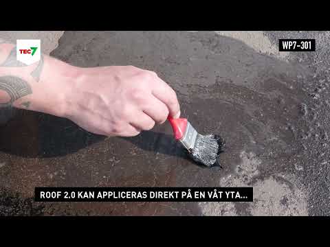 ROOF 2.0 WP7-301 är en bredbar "gummiasfalt"-massa som tätar och förseglar alla sprickor och hål på de flesta material (inklusive våta ytor), även på vintern vid temperaturer ner till -15 °C *. Den är mycket elastisk och tål förlängning på så mycket som 170 % utan att spricka. ROOF 2.0 består av en blandning av butylgummi, bitumen och glasfiber trådar. Det är mycket UV-stabil (fullt skydd med endast 1 mm tjocklek), vilket tillsammans med innehållet av butylgummi ger en mycket lång livslängd (minst 20 år) och varaktig flexibilitet. Glasfiber säkerställer bra rivstyrka och bitumen gör massan 100 % vattentät. ROOF 2.0 är väl lämpad på alla typa av takarbeide, på både plana och sluttande tak. Den tätar och förseglar rämnor, hål, skarvar, sprickor och övergångar på bland annat takpapp, takplåt, takrännor och stupsrör, samt alla typer av installationer som finns på tak; takavlopp, kantbeslag, rörgenomföringar, rörbeslag, skorstenar m.m. Den är lika lämplig för brådskande reparationer som permanent installation av ny utrustning. Det finns inget behov av värmebehandling för att få det att täta, vilket är mycket tidsbesparande (inget behov av en brandvakt). Det är också bra att använda som tätning och ytskydd på allt från fundament, väggar, dräneringsbrunnor och avlopp, till tätningar i gamla träbåtar. ROOF 2.0 är också certifierad enligt EU -standarden EN 15814 som behandlar vattentätning av fundament under marknivå.