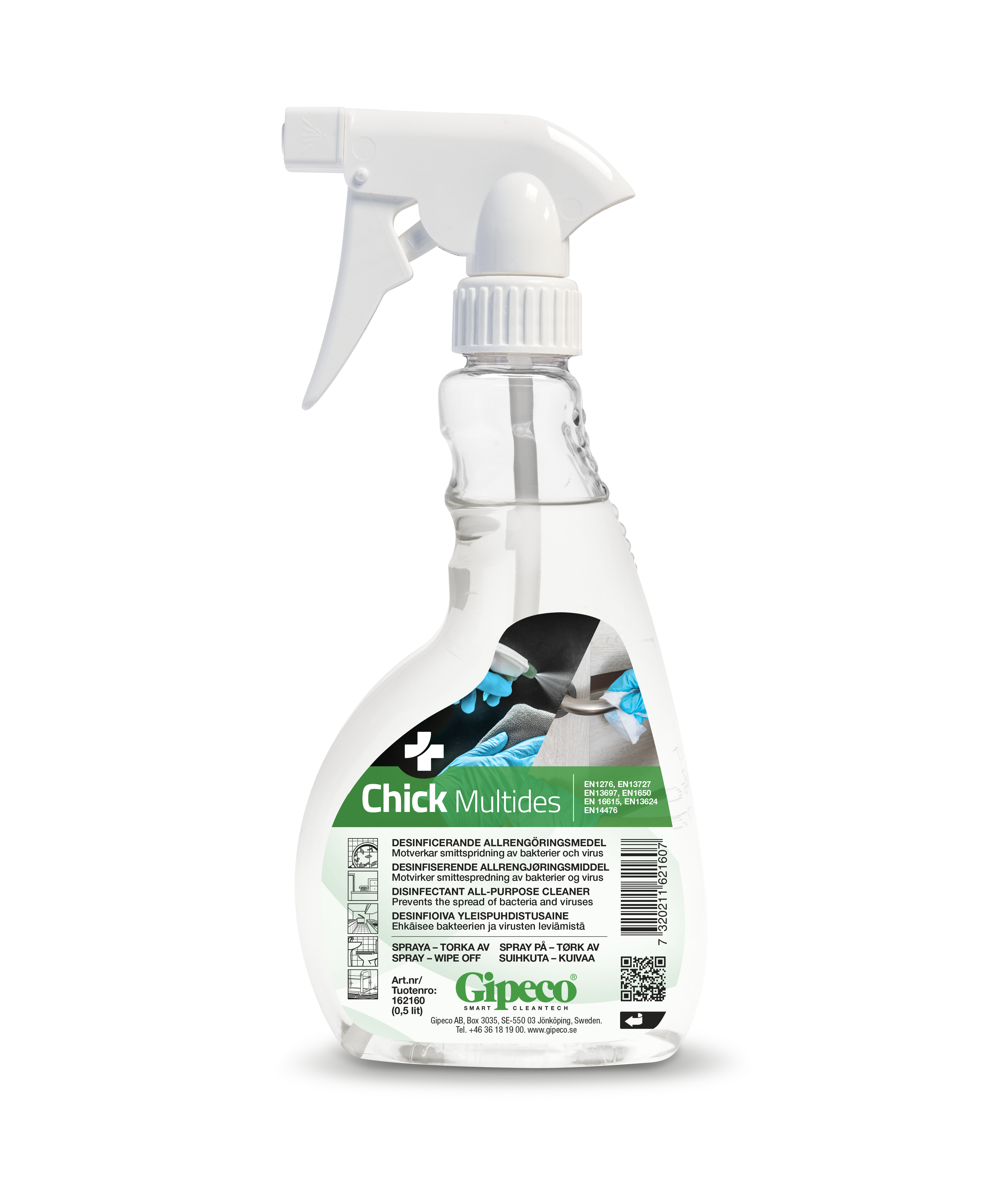 Chick Multides är effektiv mot bakterier, jäst och alla höljeförsedda virus, t.ex. SARS-CoV-2 (Covid-19).