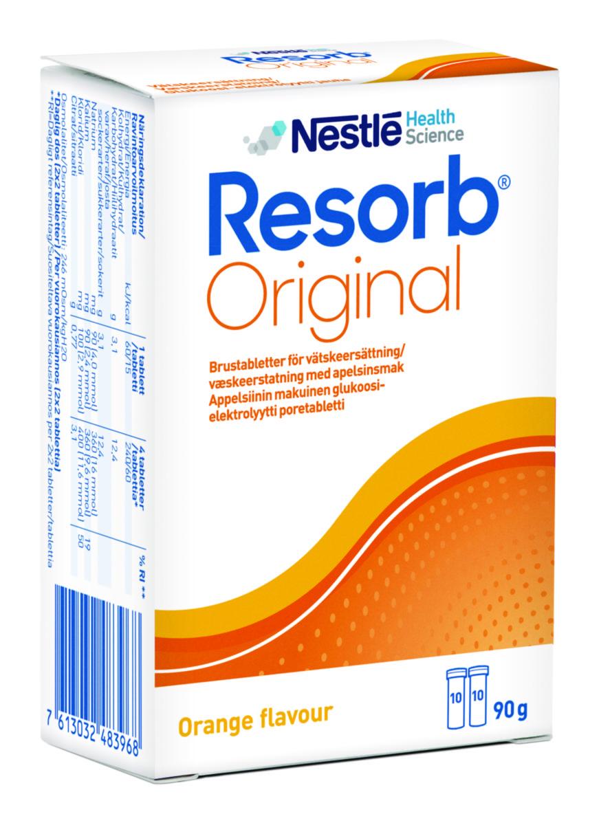 Vätskeersättning som används för att tillföra vätska och salter. Rekommenderas till vuxna och barn från 3 år. Dosering: En brustablett löses i 120 ml vatten. Finns i smakerna apelsin och hallon.