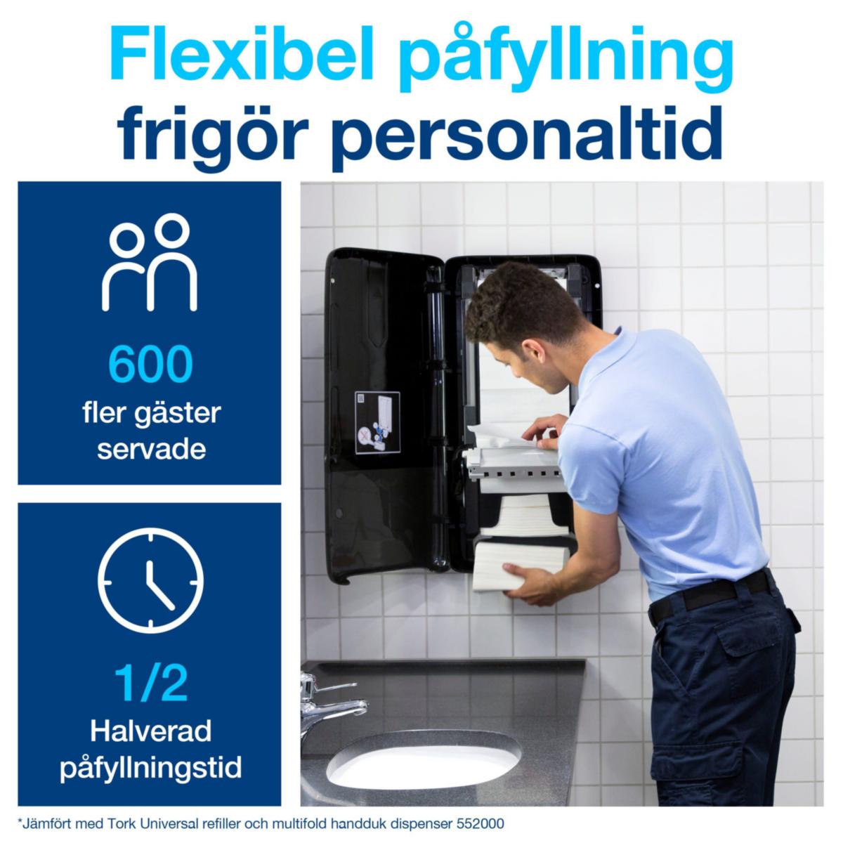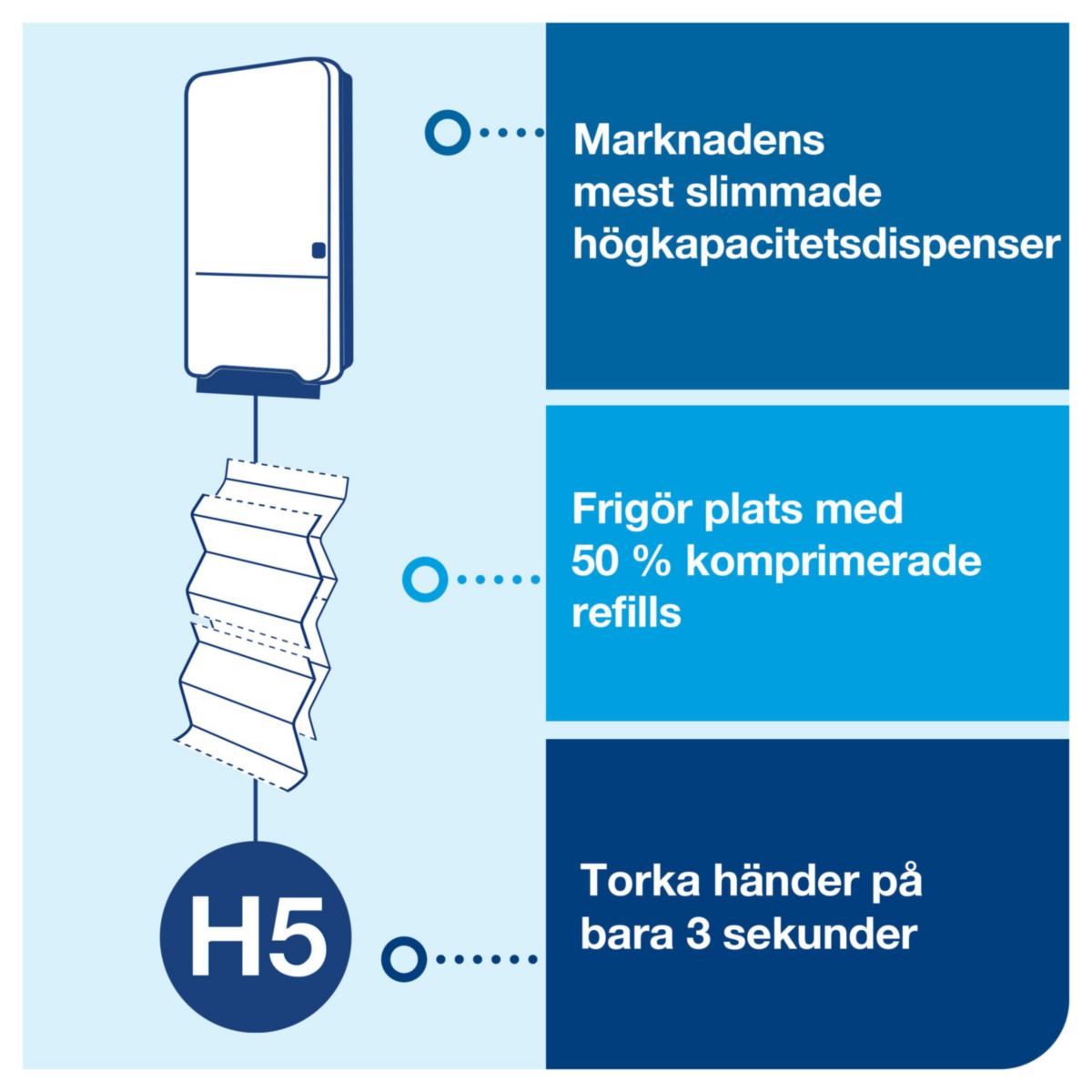 Slimmad design med extra hög kapacitet. 250% fler handdukar per dispenser minskar risken för att de ska ta slut. Snabb utmatning av en handduk i taget ger mindre förbrukning, lägre kostnader och nöjdare besökare. Kapacitet: 2100 handdukar.