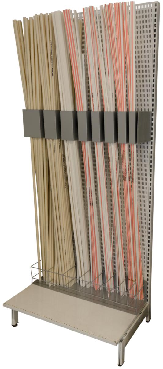 Exponeringsställ för VP-rör och/eller ledningslist samt kopparrör. Passar i 900 mm butiksinredning. Stället är 2-delat med en del som hängs längst ner på butiksinredningen och i vilken VP-rör/ledningslist ställs samt en del som håller rören/listerna på plats. Stället har 8 st fack i varierande bredd. Plåt.
