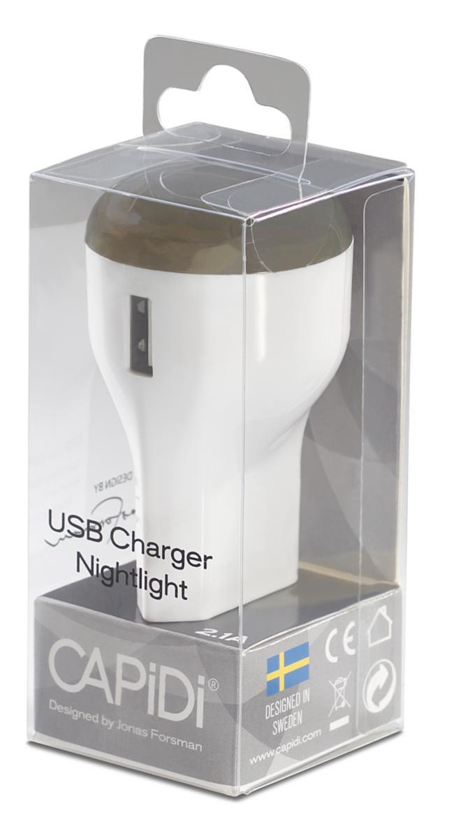 Kombinerad nattlampa och USB-laddare för mobilen, surfplattan etc. Nattlampans sken gör det enkelt att hitta telefonen i mörkret på natten. Med inbyggt skymningsrelä som tänder och släcker lampan med automatik morgon och kväll. Ansluts med europastickpropp direkt i vägguttaget. 100-240 V, 50/60 Hz. USB-uttag 5 V, 2,1 A.