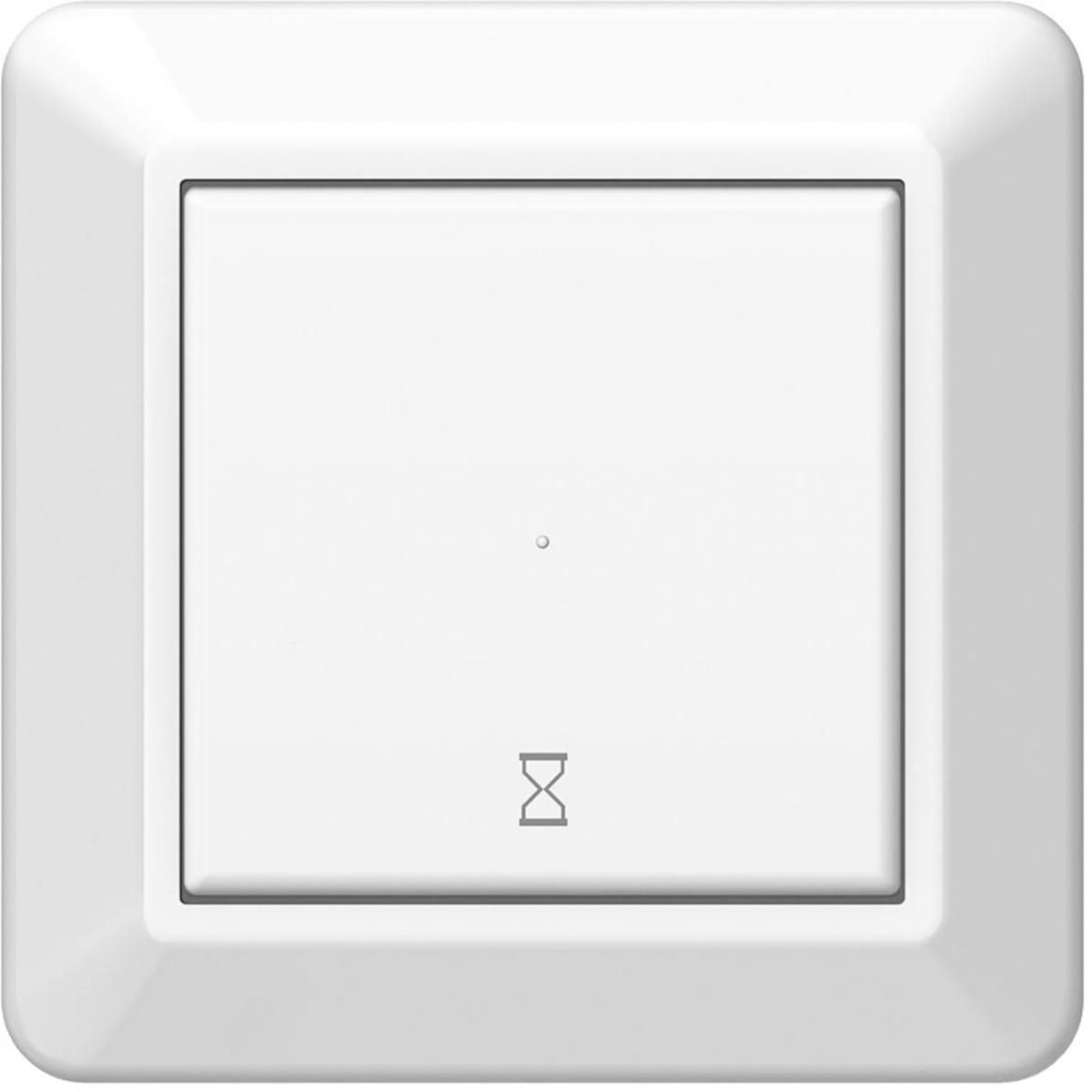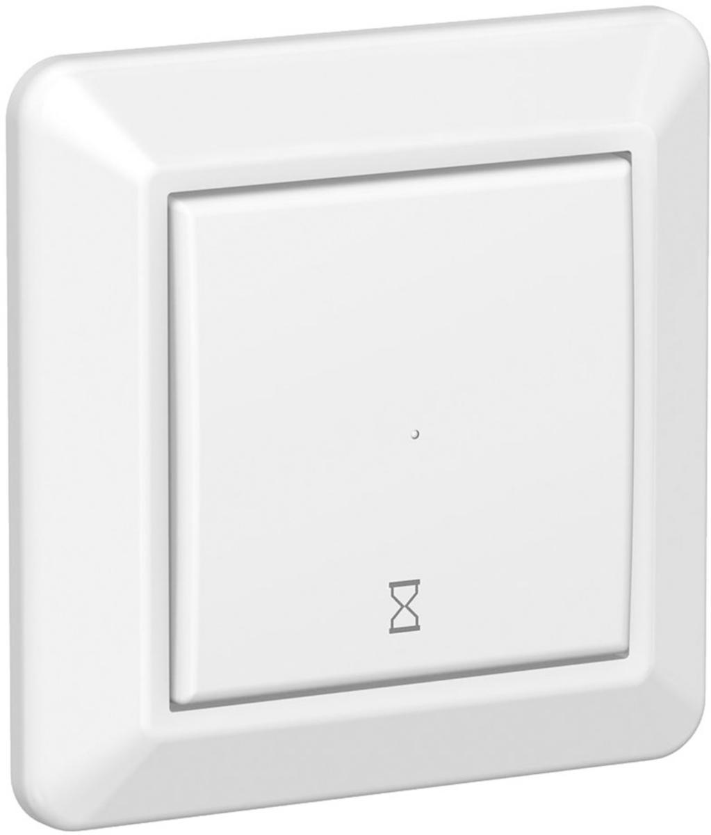 Timer med inbyggd lysdiodindikering. Timern ställs in i lägen mellan 5 min- 8 tim vid installation. För infällt montage, 10 A, 230 V. Med ram, utan fästklor. Fästskruvavstånd, 60 mm. Skruvanslutning av ledarna. Avsedd även för kombinationsmontage. Ingång för extern styrning via tryckknapp. Montagedjup 27 mm. Noll anslutning krävs (3 ledarsystem).