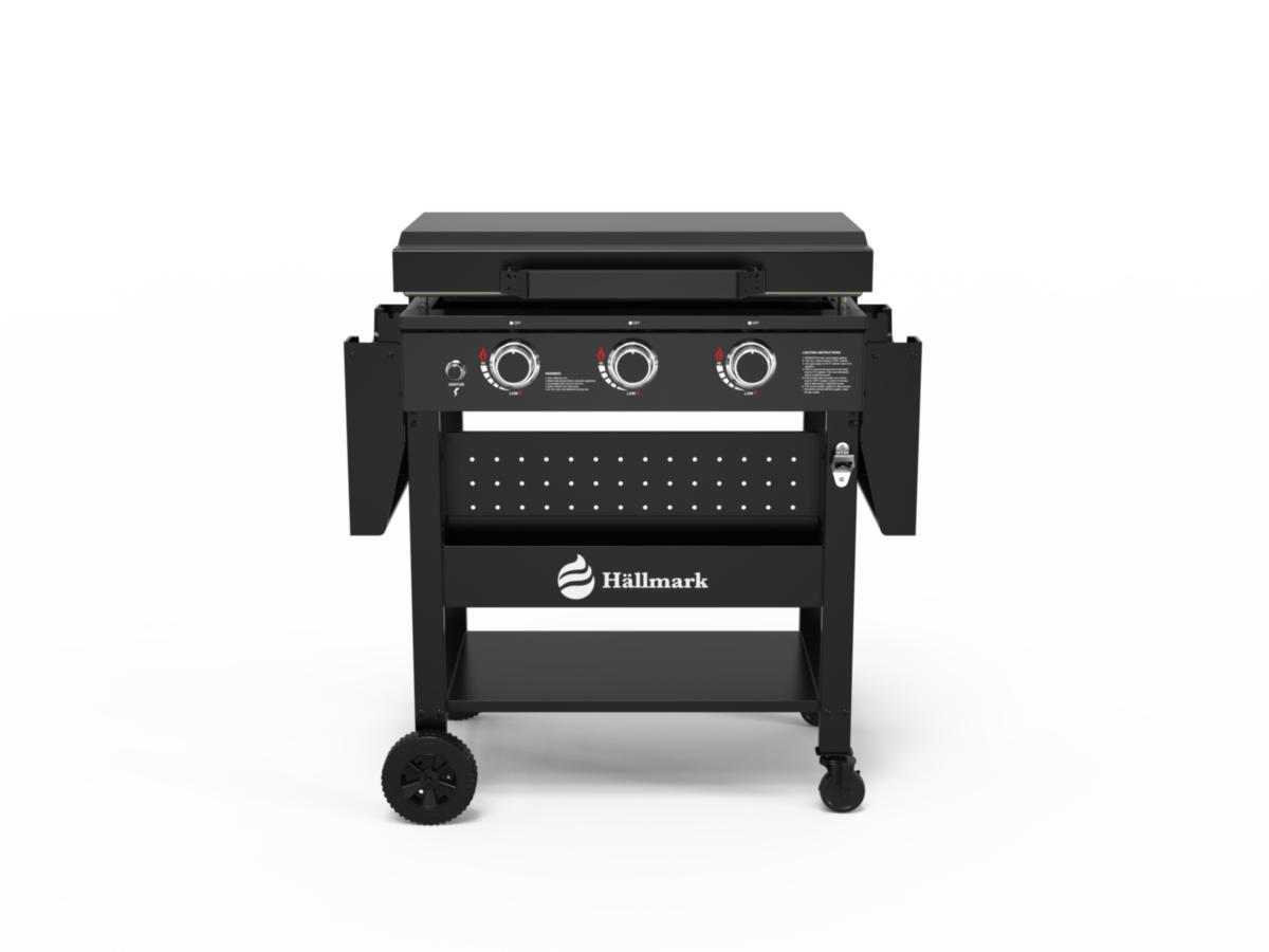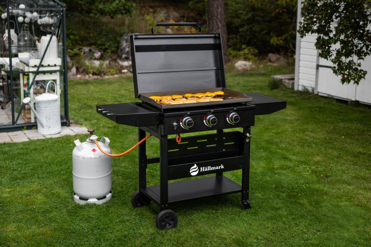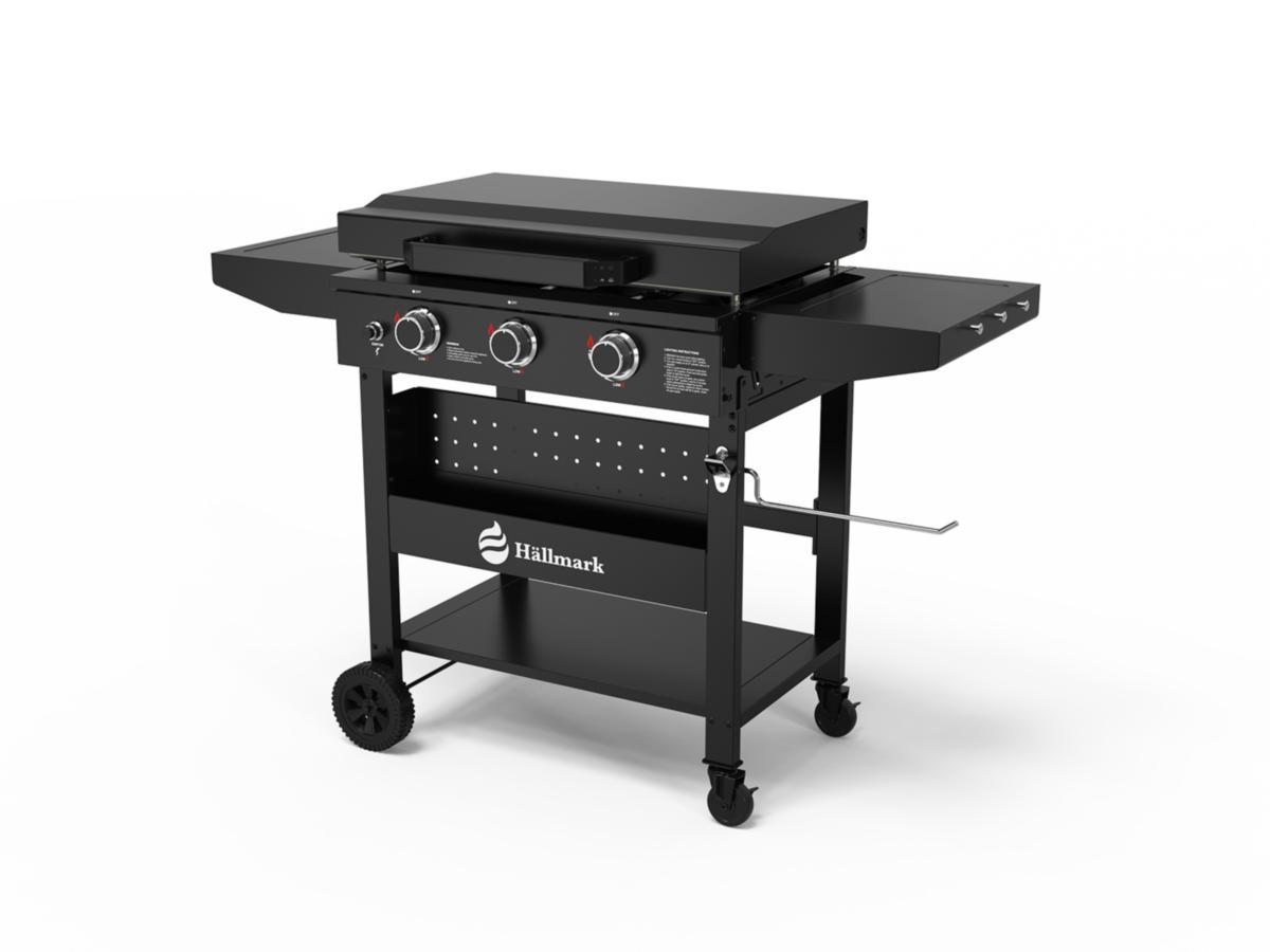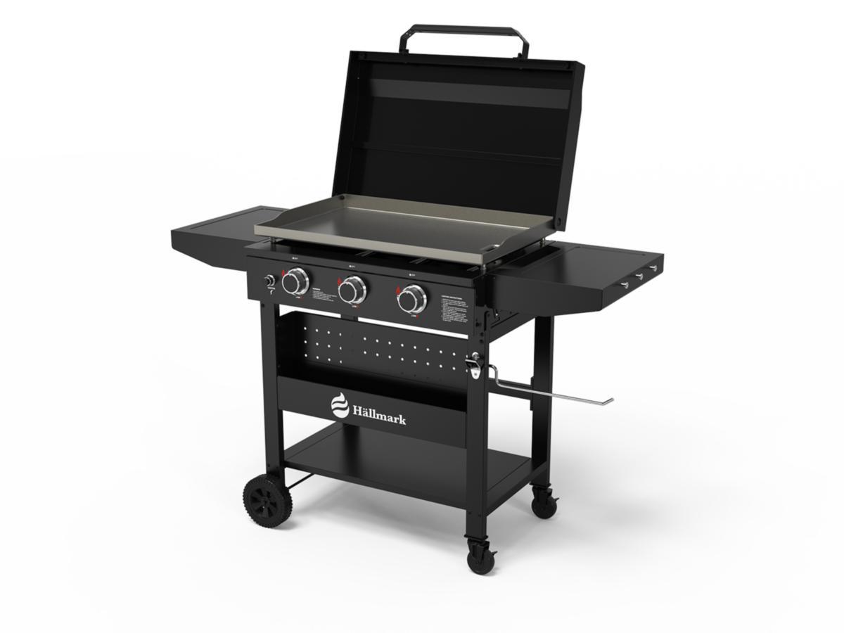 Stekbord med avställningsytor och möjlighet att reglera tre värmezoner individuellt. Fabriksinoljad häll i stål. Sidoborden är utfällbara för att minimera utrymme när bordet inte används. Hyllplan och låda undertill. Hållare för kökshandduk och krokar för redskap. Avtagbar fettuppsamlare för enklare rengöring. Regulator, slang och skyddsöverdrag medföljer.