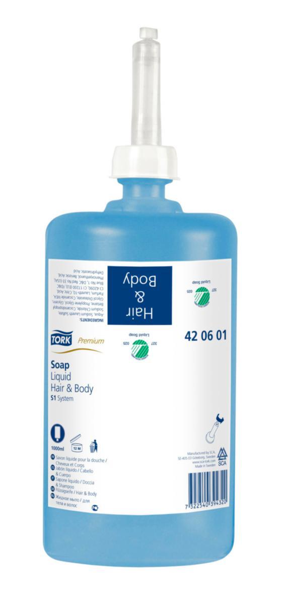 Tork Hair & Body flytande tvål är duschtvål och schampo i ett, vilket gör den till ett effektivt alternativ för arbetsplatser, hotell, skolor och sportanläggningar. Den har en mild formulering, med uppfriskande unisexdoft som ger huden och håret en mjuk och behaglig känsla. Innehåller 1000 doser. Används i dispenser för tvål S1.