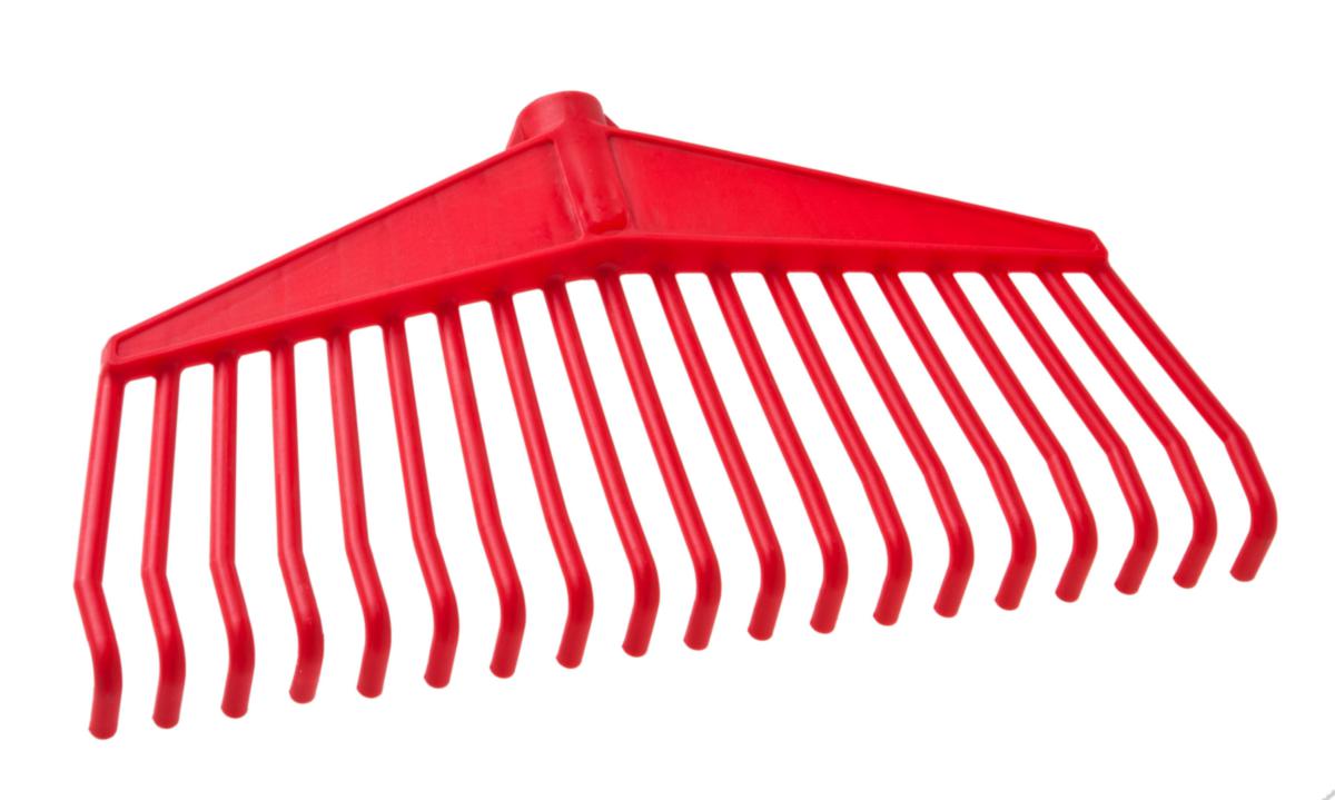 Svensktillverkad lövräfsa huvud i röd plast. Hål för 24 mm skaft.