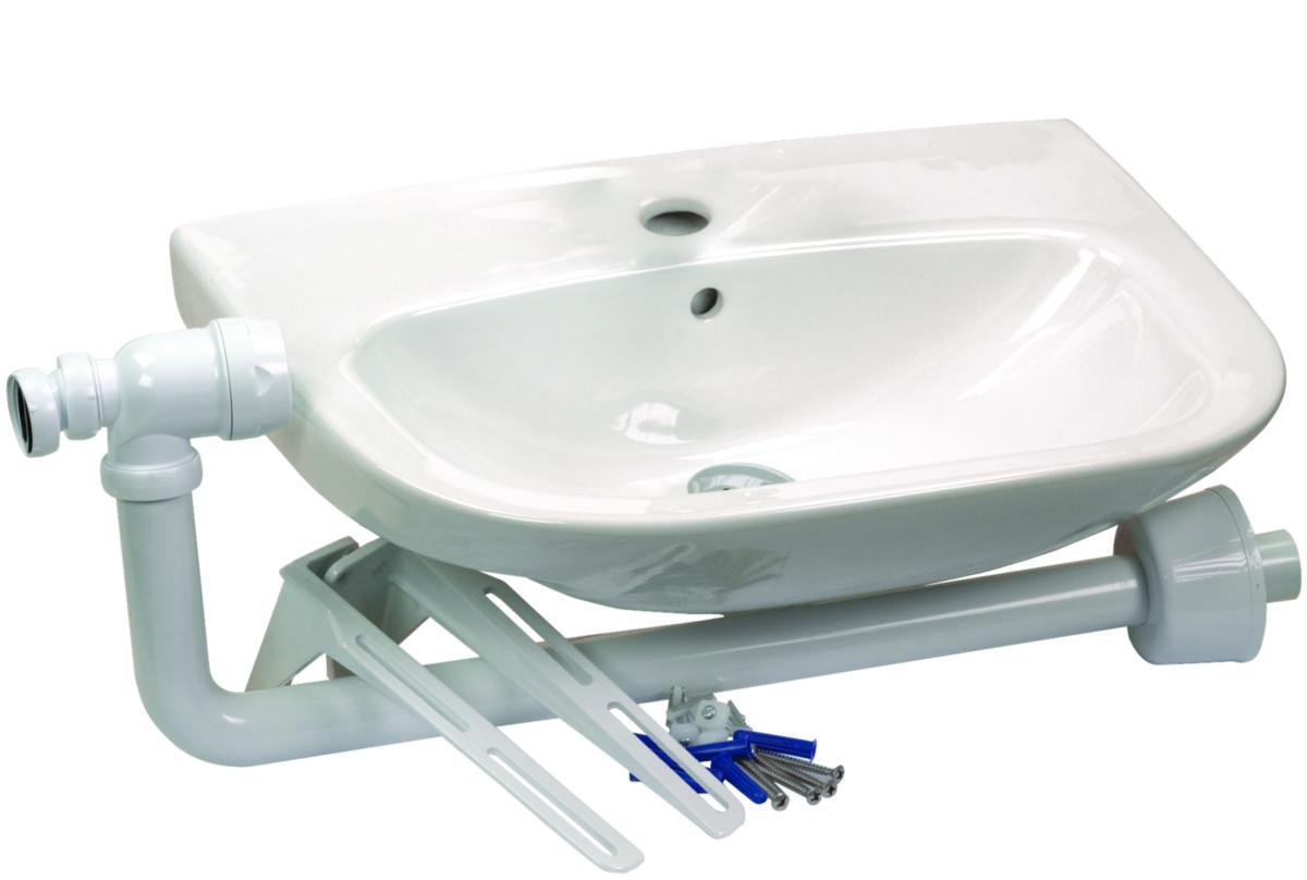 Levereras inklusive vattenlås, pop-up-ventil, konsoler 260 mm, T-bult, skruv och plugg.