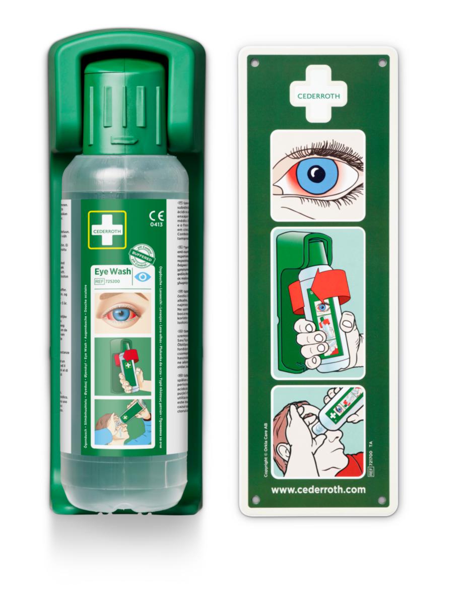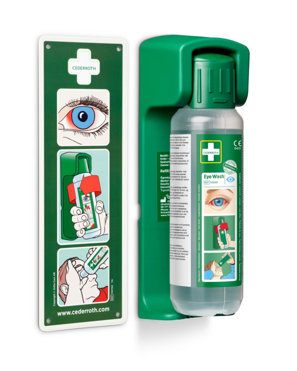 Robust och praktisk vägghållare för Cederroth Ögondusch 500 ml (7252). Med vägghållaren får flaskan en bestämd plats så att alla vet var den finns. Flaskan sitter fastlåst i vägghållaren och öppnas automatiskt när den vrids ur hållaren – ögonsköljning kan påbörjas omedelbart. Kan placeras på flera olika sätt och passar därför alla arbetsplatser och lokaler. En efterlysande instruktionsskylt medföljer. OBS endast vägghållare.