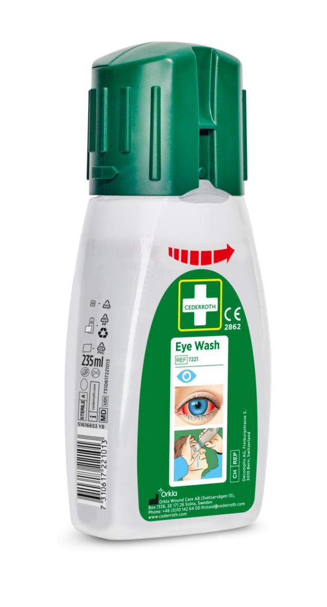 En personlig ögonduschflaska i fickformat som bekvämt kan bäras i fickan eller i tillhörande hölster. På så sätt finns den snabbt till hands vid olyckstillfället. Liten lätthanterlig flaska med ergonomisk ögonkopp och generöst flöde av vätska. Snabb och enkel att öppna. Cederroth Ögondusch är avsedd att användas vid ögonolyckor på arbetsplatser för att skölja bort främmande partiklar och skadliga ämnen. Cederroths buffrade ögondusch har också en neutraliserande effekt på stänk av alkalier och syror. Effekten är generellt starkare för alkalier än för syror. Innehåll: 235 ml steril buffrad isoton koksaltlösning utan konserveringsmedel. För engångsbruk. Hållbarhetstid 4,5 år.