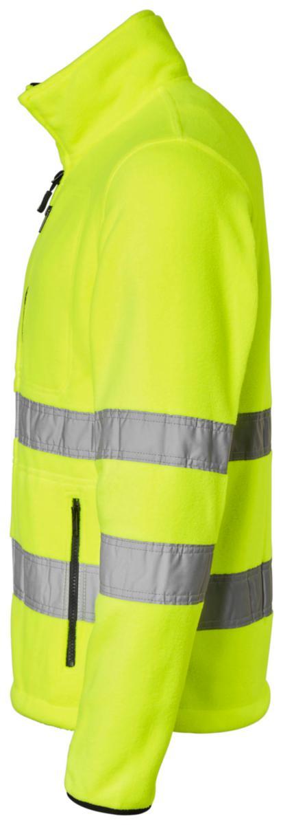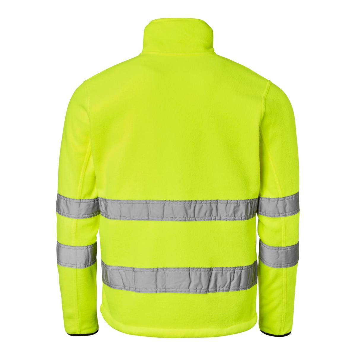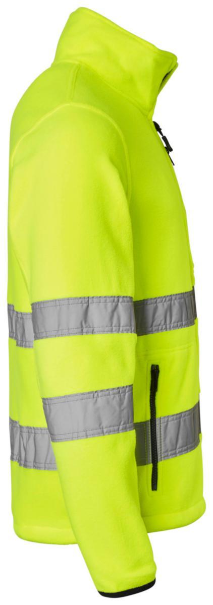Fleecejacka med en bröstficka och två framfickor med dragkedja. Dragsko i nederkant. Material: 100% polyester. Standard: EN 20471 klass 3.