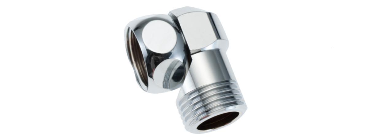 Anslutningsvinkel G15 med lekande mutter 90°. Utvändig gänga x löpmutter. Förkromad.