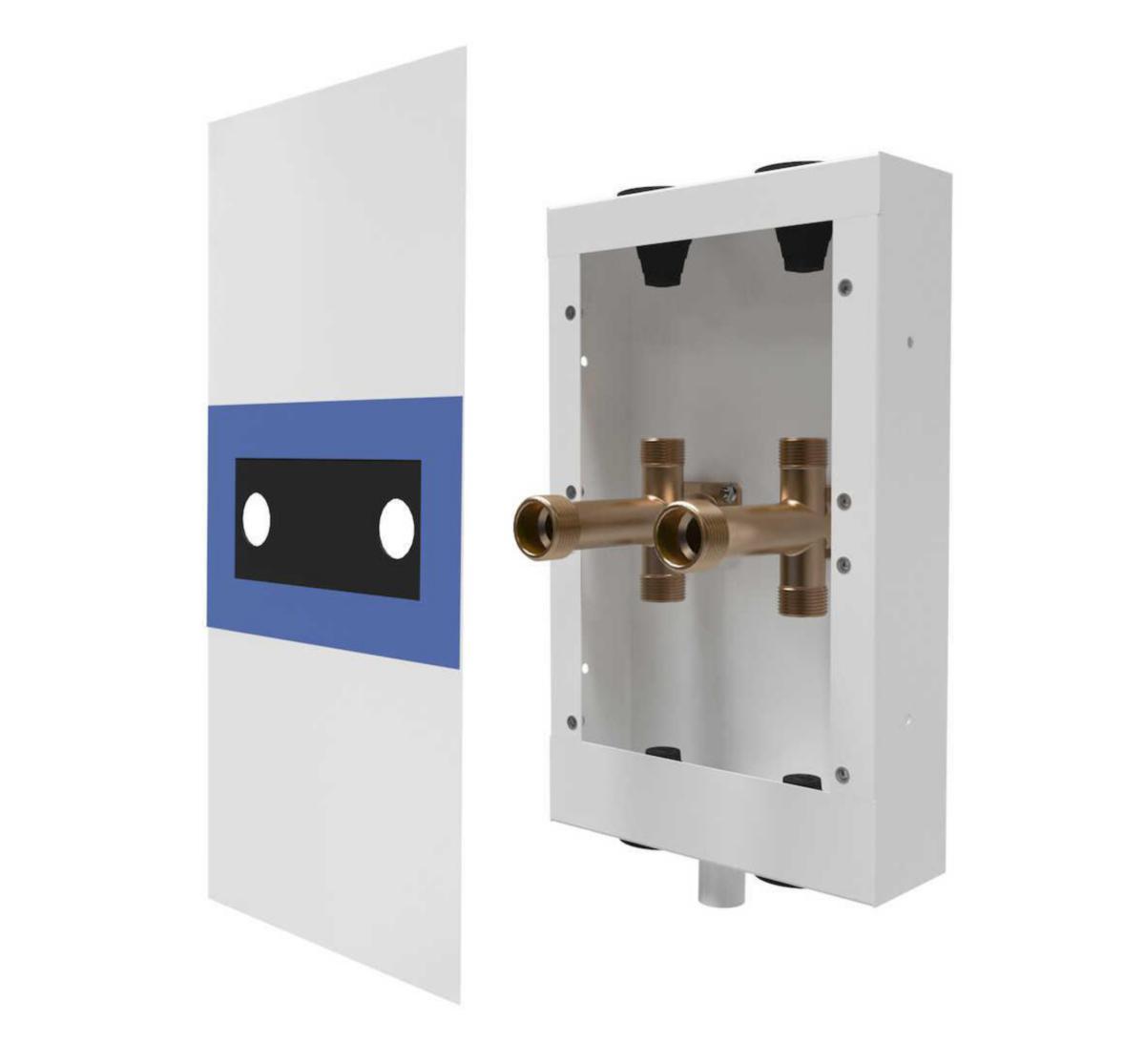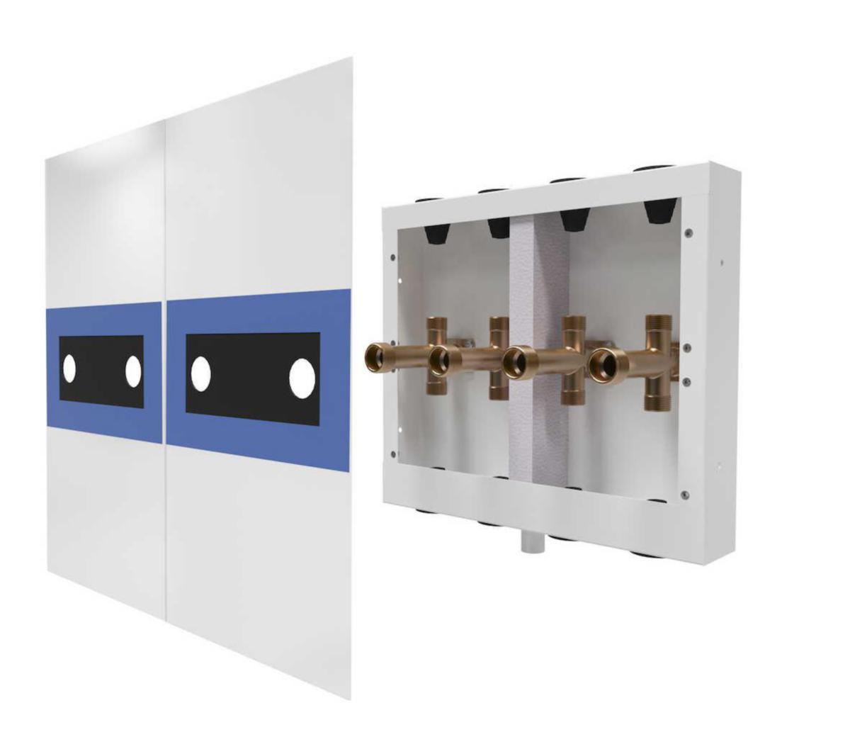 LK Fördelarskåp UNI VP finns i två varianter, en för anslutning av fyra rör samt en för anslutning med två rör ut genom vägg. Skåpen kan enkelt monteras samman för att skapa ett modulärt system där sex rör kan anslutas.