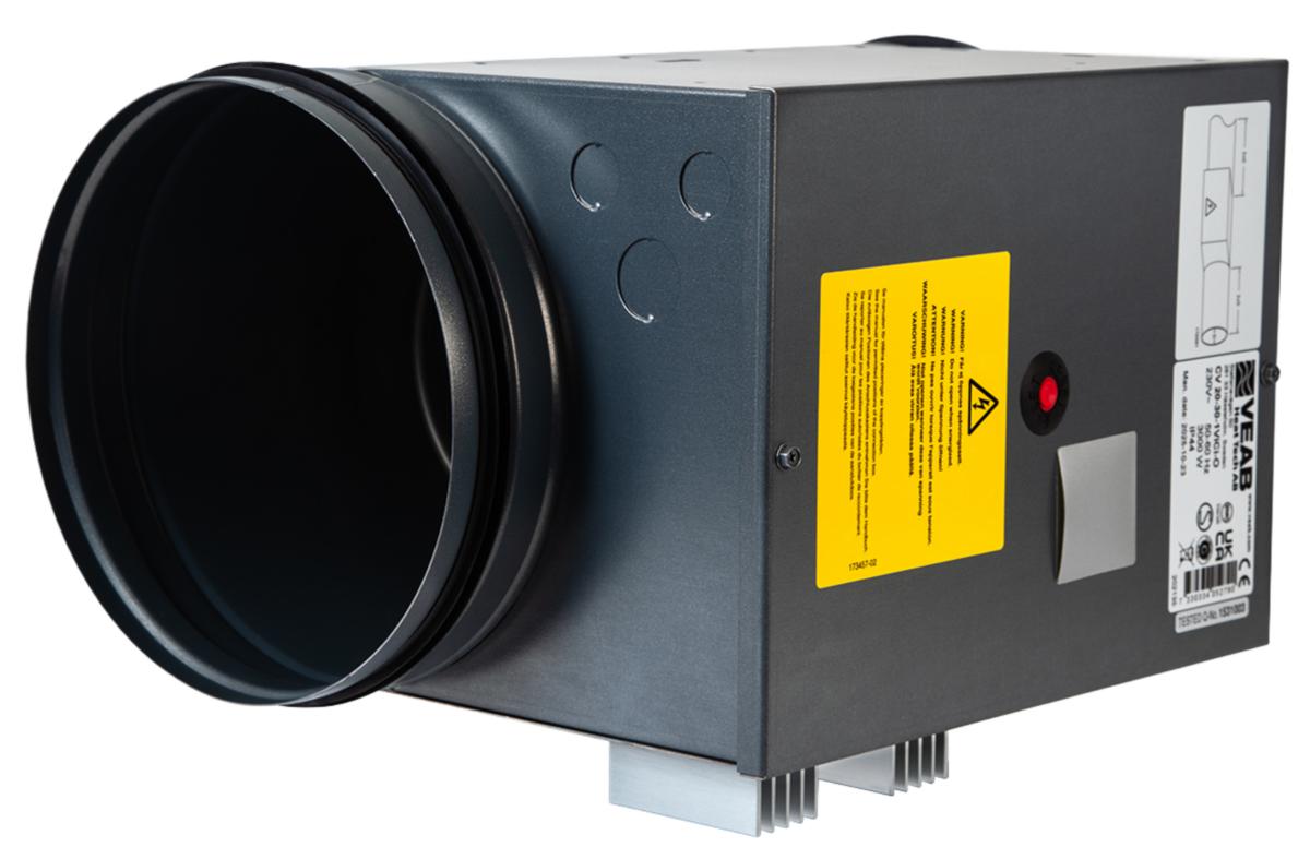 VEAB cirkulära kanalvärmare används för att värma ventilationsluften till enskilda rum och zoner med individuellt styrda temperaturer, alternativt för att eftervärma i ventilationsaggregat och värmeåtergivning. I rätt dimensionerade system kan de även värma upp hela byggnader. Kompletteras med en extern temperaturregulator. Dessa kan monteras på vägg eller i apparatskåp. Regulatorer och givare beställs separat. Kanalvärmaren kan monteras både horisontellt och vertikalt. Höljet tillverkas i stålplåt med en beläggning av magnelis ZM310 som gör att plåten uppfyller korrosivitetsklass C5.Värmeelementen i rostfritt stål, EN 1.4301. I kopplingslådan finns erforderliga plintar för den elektriska inkopplingen. Kanalanslutningen passar för iskjuts(nippel)-montering i runda kanaler. Samtliga modeller av CV har två överhettningsskydd, ett automatiskt återgående och ett manuellt återställbart. Dessa är vid leverans kopplade i serie med värmeelementen och behöver därför inte kopplas till något externt relä. Täthetsklass C enligt EN 15727. Kapslingsklass IP43 som standard.