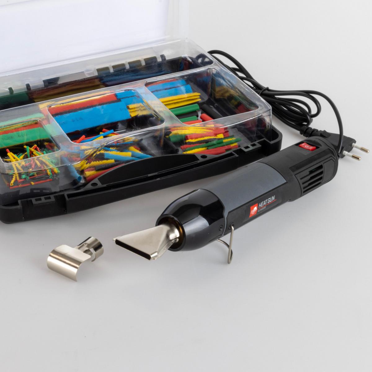 Varmluftspistol och krympslang i sats. Värmepistol med justerbar temperatur i två lägen, läge 1: 230°C - 180 l/min och läge 2: 400°C - 250 l/min. Levereras med två olika munstycken som förenklar krympning av slang och plastfilm.