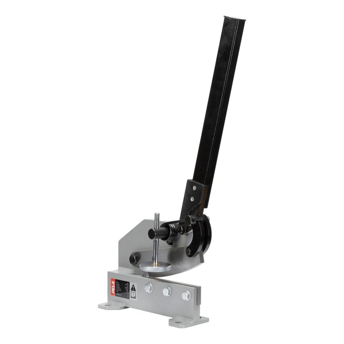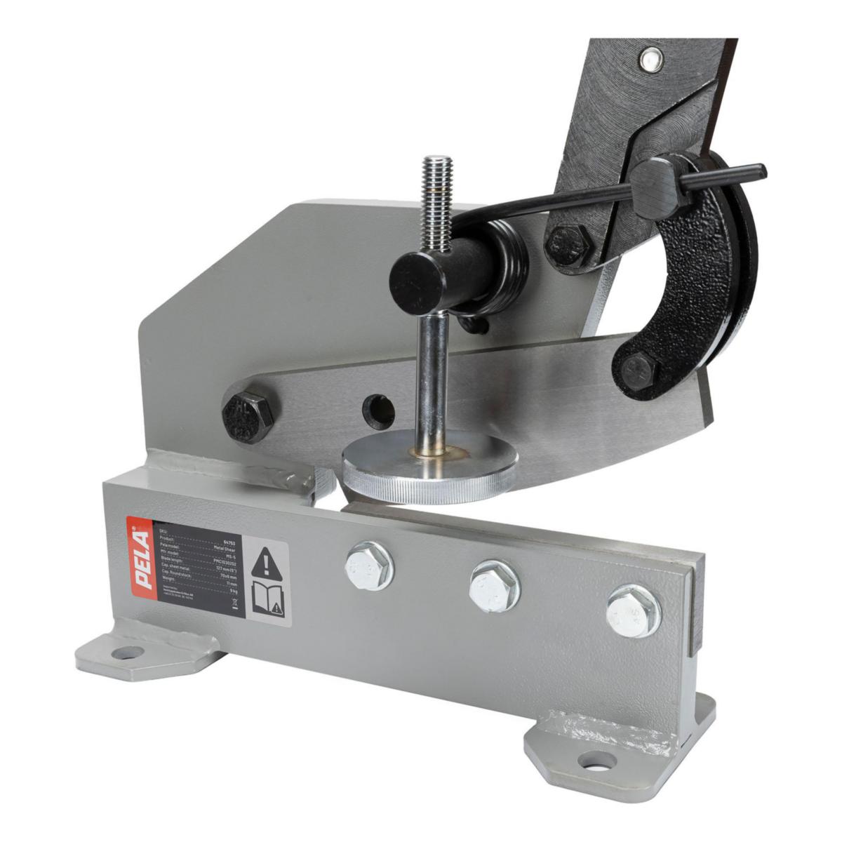 Handdriven plåtsax för montering på bänk. Försedda med justerbara nedhållare. Hävarm försedd med returfjäder.