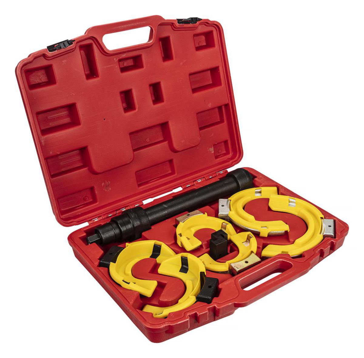 För demontering och montering av fjädrar på alla typer av McPherson fjäderben. Passar fjädrar: Ø 80-115 mm, Ø 110-150 mm, Ø 140-195 mm. Drivmutter 21 mm sexkantsfäste. Armarna försedda med plastskydd. Axeln är justerbar 300-453 mm. Ligger i praktisk plastväska. Max belastning 1040 kgPlastväskans mått längd 530 mm djup 420 mm höjd 130 mm.