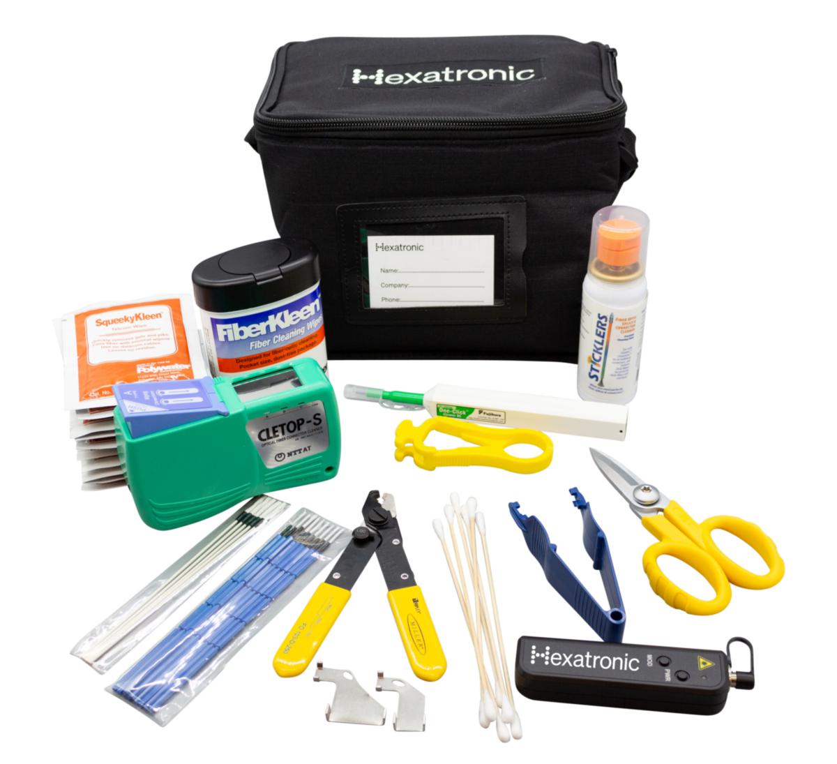Verktygskit för fibersvetsning och rengöring, innehållande, kevlarsax, fiberstripper, pincett, tops, tubskärare, visuell felfinnare, urtagningsverktyg SC mellanstycken, rengöringsservett SqueekyKleen, rengöringspenna One-click, rengöringssticka Cletop, rengöringskassett Cletop och rengöringsservetter FiberKleen