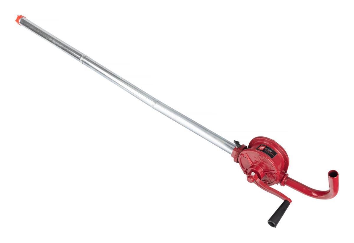Oljefatspump med vev och böjd avtappningskran Ø25 mm. Pumphus av gjutjärn. Storlek pumphuvud Ø130 mm. Inlopp Ø32 mm. Kapacitet 22 l/min.