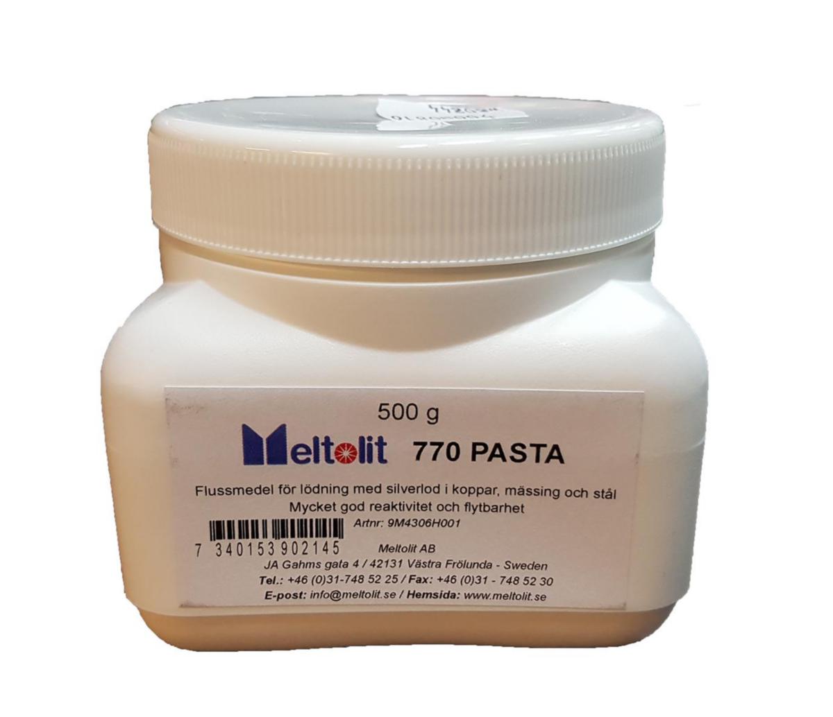 Meltolit 770 pulver och pasta är ett flussmedel för lödning med silverlod i koppar, mässing, rostfritt stål och vanligt stål. Flussmedlets uppgift är att bryta metalloxider på metallen för att få vidhäftning med silverlodet på materialkombinationen koppar, stål, mässing, stål etc. Mycket god reaktivitet och flytbarhet. Används även vid lödning med silverfosforkopparlod för att sammanfoga koppar med mässing. Vid användning av 770 pulver blandas detta ut med destillerat vatten och lite t-röd.