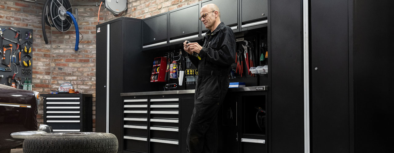 PELA erbjuder kompletta garageinredningar som effektivt och snyggt skapar ordning på prylarna i garaget eller verkstaden. Det finns också skåp och arbetsbänkar som kan kombineras utifrån yta och behov för att ge din kund den optimala lösningen. En bra inredning med massa praktisk förvaring i kombination med en arbetsbänk gör det lätt och roligt att arbeta.