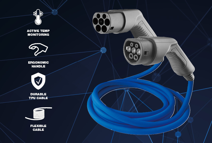 Amptec laddkabel finns i olika längder för 1-fas och 3-fasladdning av elbilar.