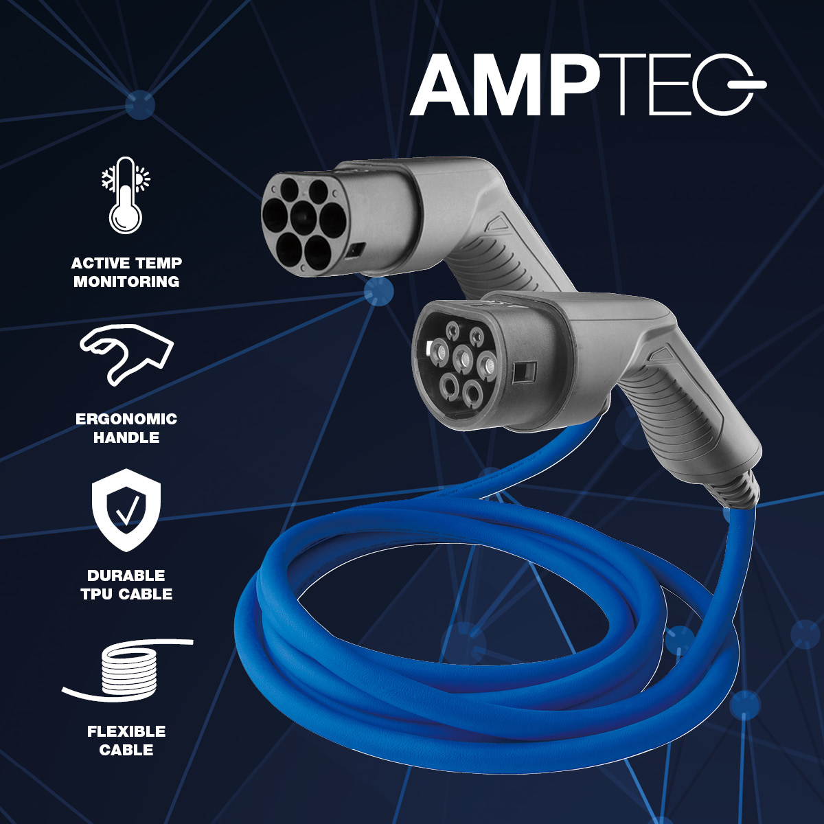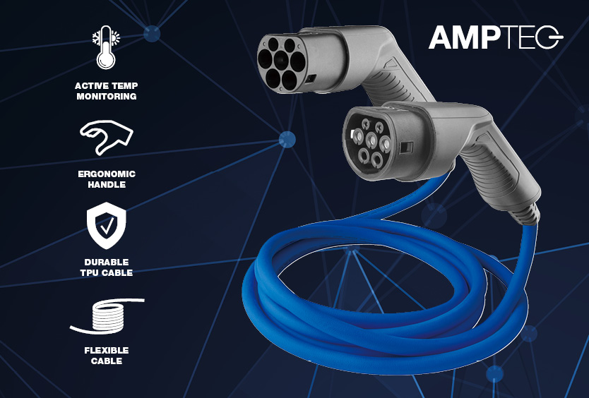 Laddkabel med uttag typ 2 för att ladda via stationära laddboxar eller laddstationer med kontaktuttag typ 2. Mode 3-kablen ger dig säker laddning hemma, på arbetsplatsen och övriga platser där laddbox/laddstation finns. Amptec laddkabel finns i olika längder för 1-fas och 3-fasladdning av elbilar.
